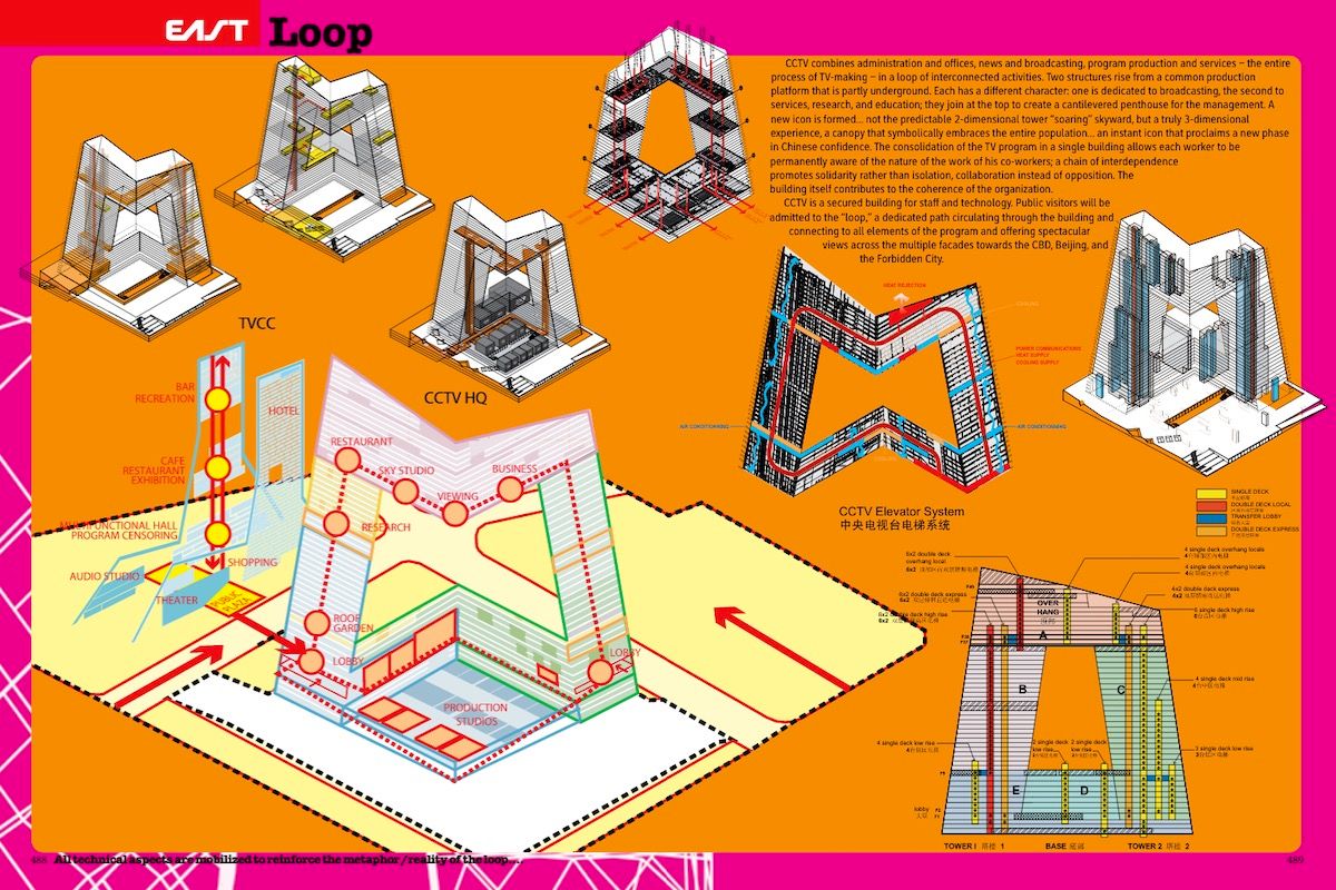 Content and SMLXL have much in common. Both are a real treat if you enjoy an eclectic mix of text and images. Paintings by Vermeer are paired with stills from Big Brother and there's a lot of cut and paste layering of images. One of the most notable differences is that in Content, with the exception of a two-page layout of the CCTV Tower in Beijing, architectural drawings have been left out altogether. I think this is significant. Architectural drawings are only of interest to architects. Anyone else only sees a dense pattern of black lines and some unreadable numbers. By leaving them out OMA|Rem Koolhaas make a clear statement about the direction the architectural monograph is heading into and the audience it aims at. Call it emancipation. If you’re interested in the drawings I’m pretty sure you can find them in the next OMA|Rem Koolhaas issue of El Croquis. [Update: El Croquis 134/135]