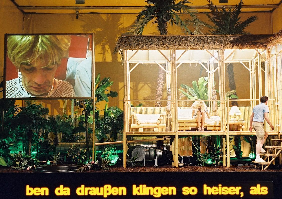 Castorf has transposed the setting to a holiday resort on a tropical island, a place where the outside world with all its problems doesn't enter, but inner problems fester all the more. We see a bungalow on stilts surrounded by fake palm trees. Inside the bungalow we see a bedroom with a double bed and a kitchen with a bar. Some elements of the set design only become apparent well into the performance. To the left of the house is a pool, in which the characters bath, tumble and try to drown themselves.