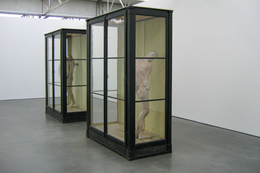 Centrepiece of the exhibition is "One" (2003-2004). It consists of two man-size cupboards with a glass front. Like most of the supporting materials in De Bruyckere’s work, tables, shelves, cupboards, the paper she draws on, it looks worn-out, which is another way of saying that it has a history. Inside there are nude figures, their heads deformed as in a Francis Bacon painting.