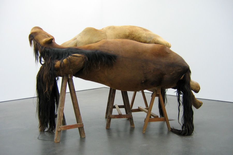 In the exhibition at De Pont a recent work ("Joined", 2003-2004) shows two horses, their bodies stitched together, resting on three wooden trestles, the hair of the tails touching the ground. It is a poignant image. Horses don’t usually lie down, they just stand there, and when they do, they instantly get up. I had to fight the urge to caress them, - this is a museum -, to let my fingers run through the hair and to tell them that it’s OK, that they’ve been loved and will be remembered.