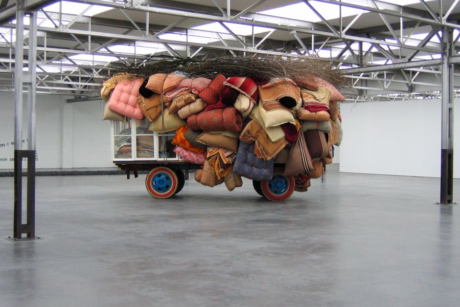 Upon entering the main hall of the De Pont Museum of Contemporary Art my attention is instantly drawn towards a large trailer loaded with blankets, pillows, mattresses and branches. I cannot help noticing that it stands where, until a few weeks ago, there used to be a circle of white stones by Richard Long. I wonder how long it took to remove them all and whether each stone was numbered. You can still make out the work's contours from the slight discolourization of the floor. It makes me think of some other works by Richard Long, which he created by walking a circle or a line in a landscape. They could have made a new sign, Richard Long, "Untitled" (2005).