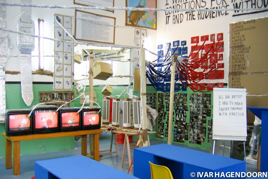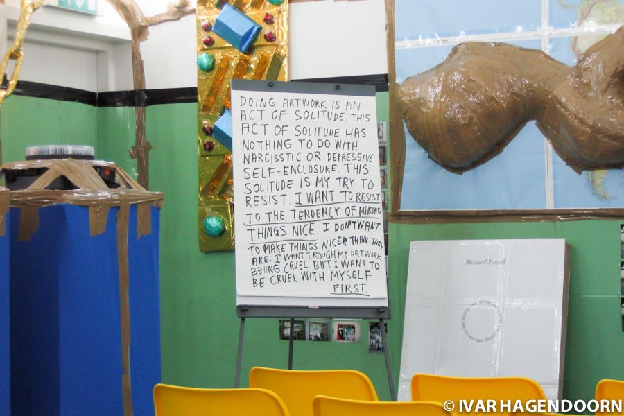 There is a lot to see at "Anschool", as the exhibition is called. It is set up as a school with classrooms, reading desks, plastic yellow chairs and desks covered with blue canvas. The floor has been furnished with blue linoleum. When you notice you realize that that is what you smelled. There are maps on the walls with mountain rugs of industrial tape that look like some kind of tumors. Anschool is to school what anarchy is to established order and what the Body without Organs of Deleuze and Guattari is to the organism. As it says in the press release "Anschool rejects analysis, training and the creation of a 'school'. (..) Anschool stands for courage, curiosity and perseverance." I like that. I also like it when Hirschhorn states that he doesn't want to make things nicer and that "better is always less good."