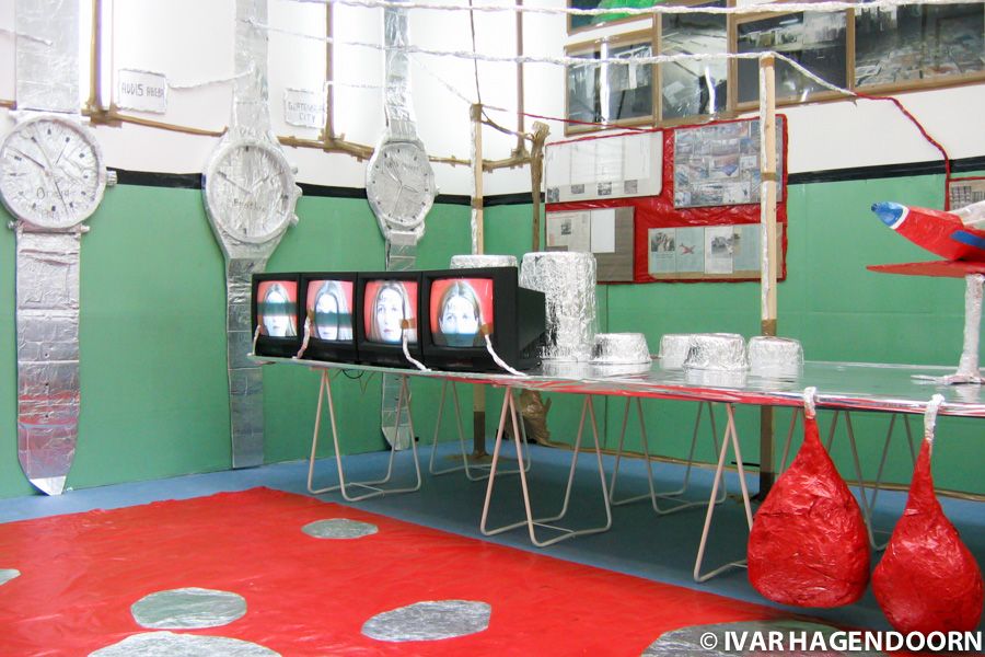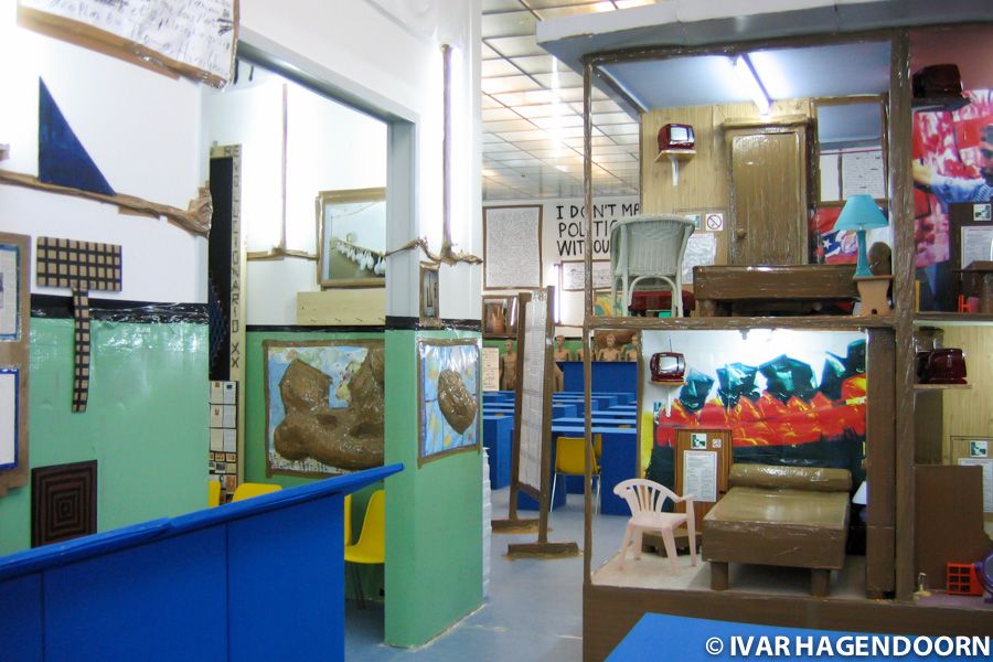 Anschool is at once a project in itself as a retrospective of some of the projects Hirschhorn has realized in the past few years. There's his "Pilatus Transformator" (1997) and "Hotel Democracy" (2003), first exhibited at the Tate Modern, a huge, 15 meter long 2+ meter high doll house, with enlarged news photos as wallpaper. Sleep tight while the world is burning. Hirschhorn has mixed real furniture such as mirrors and table lamps with doll house furniture and children chairs. Something is out of order in the new world order. Every room features an emergency exit, but they don't lead anywhere, they're just illustrations on the wall.