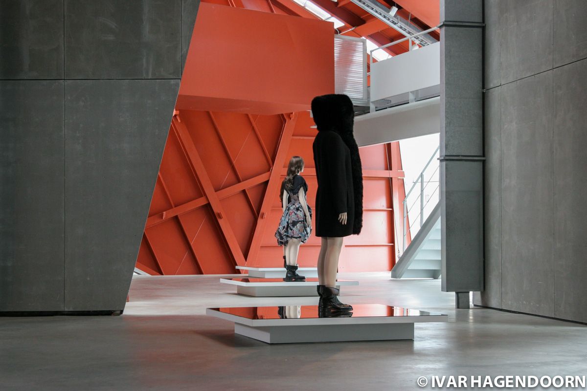 The most interesting part of the exhibition is the setting Hussein Chalayan created in the Coop Himmelb(l)au pavilion of the Groninger Museum. I loved the reflections in the mirrors on which the mannequins are standing.