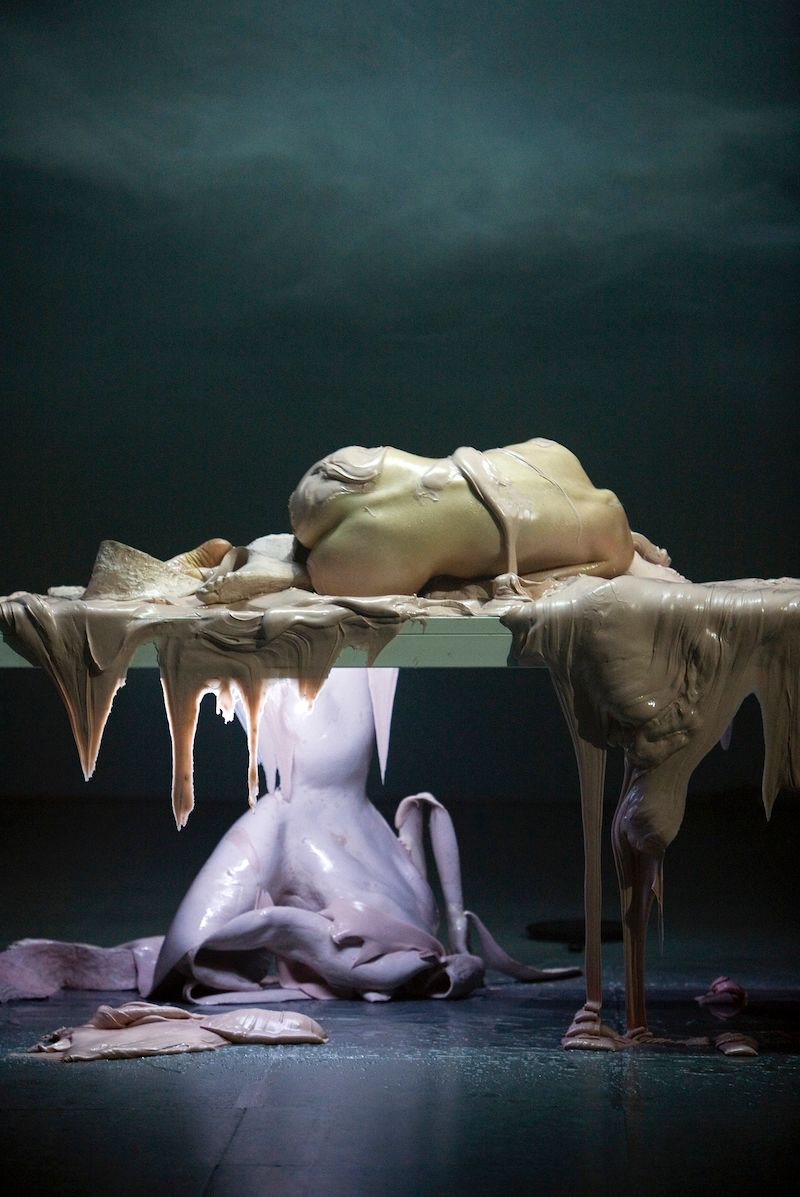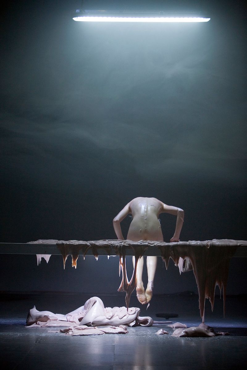 Romeo Castellucci creates scenes and images that are pregnant with meaning yet never deliver. In Hey Girl! a nude girl arises from underneath a layer of melting wax or clay. She gets up and looks into a mirror. She puts on a white t-shirt and a pair of jeans. She lies down next to a sword. She sprinkles perfume on the sword, which makes a hissing noise. The sword is hot. With the sword she burns a cross in a white sheet. She whispers the names Jeanne d’Arc and Maria Stuart. She picks up the sword. A loud noise. A neon sign in the upper right corner of the stage displays an R. The girl walks to the right. Another loud noise. A neon sign on the upper left side of the stage displays an L. The girl walks to the left. Right. Left. Right. The girl is beaten down with pillows by a group of some 30 men. The girl emerges with an enlarged mask of her own head. The girl cries. The men disperse. Some look at her through glass windows. Words and fragments from Shakespeare are projected on a screen. A black woman wearing a mask of the girl’s enlarged head emerges from the crowd of onlooking men. An old man with a beard. The black woman is undressed and chained. The glass windows break. Music. The black woman dances. Shrieking noise. A beam of light pierces through the air and seems to cut into the girl’s head. A wooden panel falls and is raised again revealing a reproduction of Jan van Eyck’s "Man in a Red Turban".