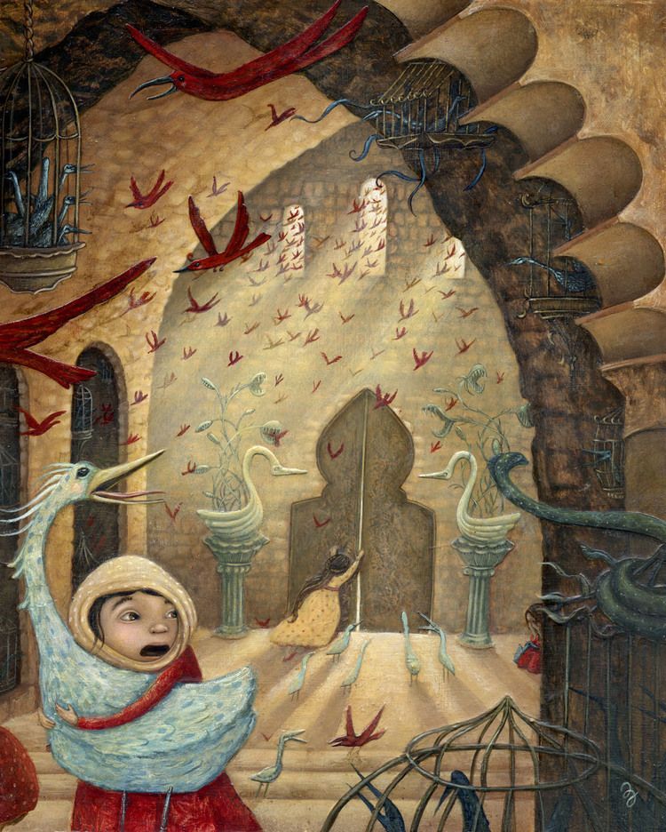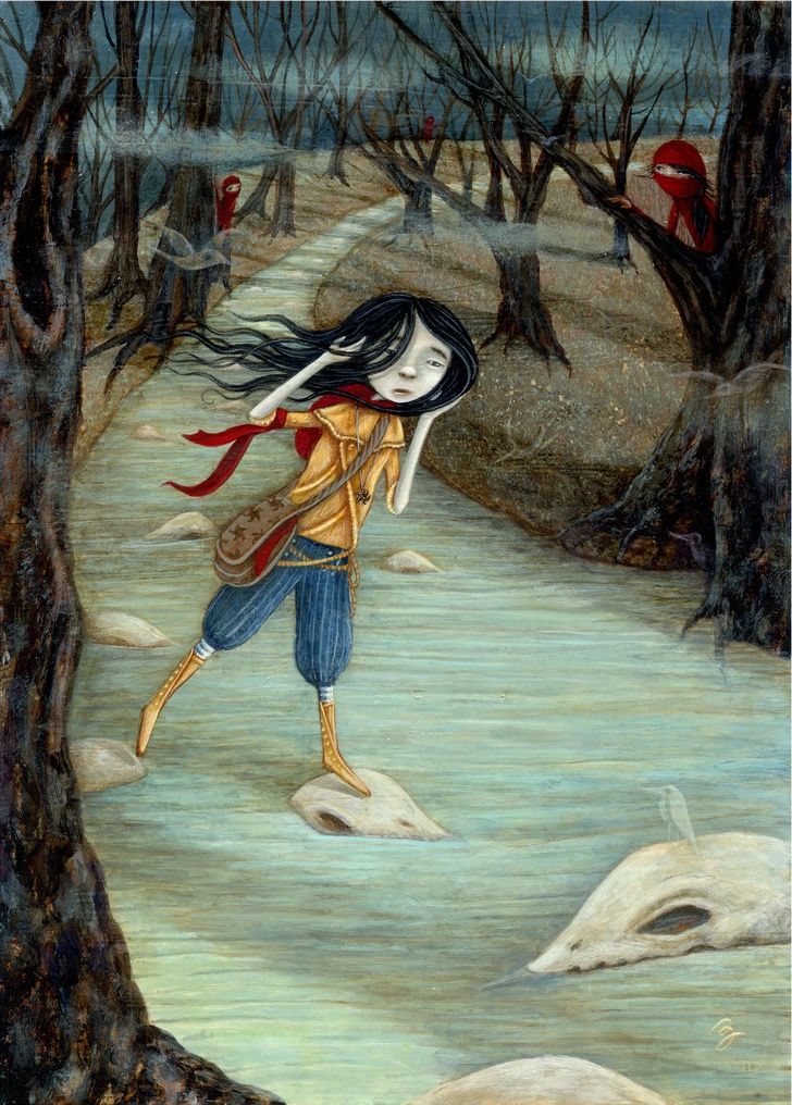 There were a couple of images in Illustration Now 3 that tipped the scale for me. Jaime Zollars' dark fairy tale drawings are just wonderful. She creates striking visual metaphors of childhood fear. In one picture a girl is walking on a path, which doubles as a river, through a forest of leafless trees. She has to jump from skull to skull. From behind two trees masked figures spy at her. As with the picture above, I have the feeling that I totally understand it, even though when you try and put it into words it always sounds rather banal, so I won't even try.