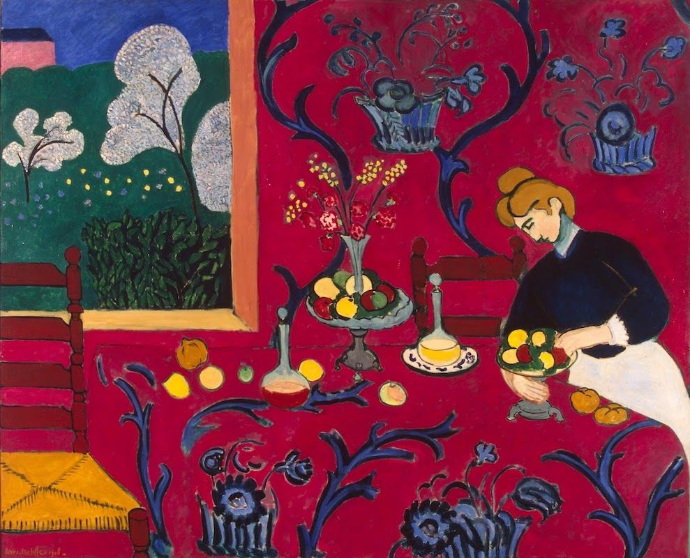 Kees van Dongen, Lucie and her Dance Partner (left); Henri Matisse, The Red Room (middle); Pablo Picasso, Table in a Cafe (right)