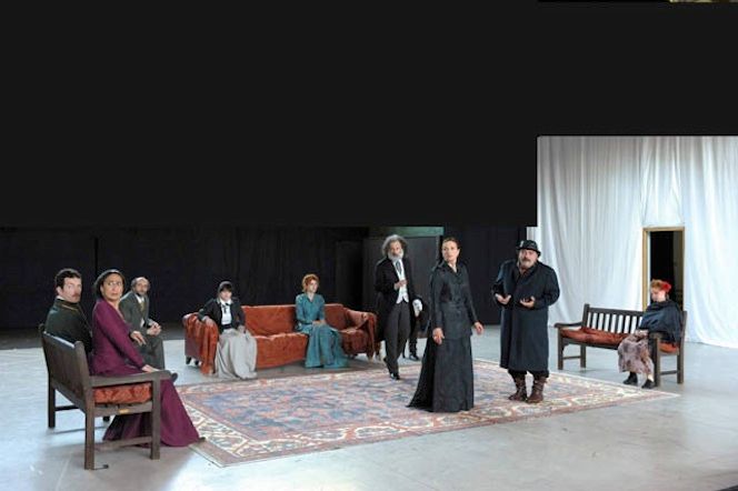 I Demoni runs over 11 and a half hours, including six intervals, and comes with a cast of 26 actors. The stage design is sparse. Some chairs, a table, a couch, a moving wall. The music and sound effects are performed live. It is back to basics. Theatre as a community event. The first performances took place at Peter Stein's estate in Umbria, Italy, where performers and (invited) guests enjoyed lunch and dinner together. The tour is more conventional, even though the program booklet promises that the production "will completely reinterpret the connection with the audience that will become active part of the event, and not just mere observers, during the day spent 'together with the play'". (If you want to have a drink with the actors during the performance you should go and see Roman Tragedies by director Ivo van Hove and Toneelgroep Amsterdam).