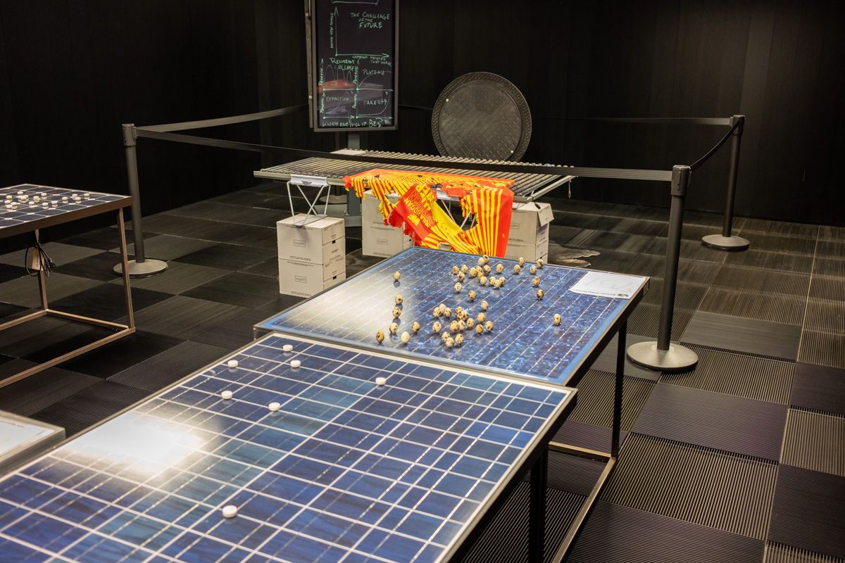 One room consists of a number of tables with what look like strategic war games and two custom made chairs. In the other room are plastic chairs on wheels with arm rest tables, aircraft tyres, airline blankets and various other objects. Each of the objects has been designed and crafted with a lot of attention to detail creating an excess of meaning.