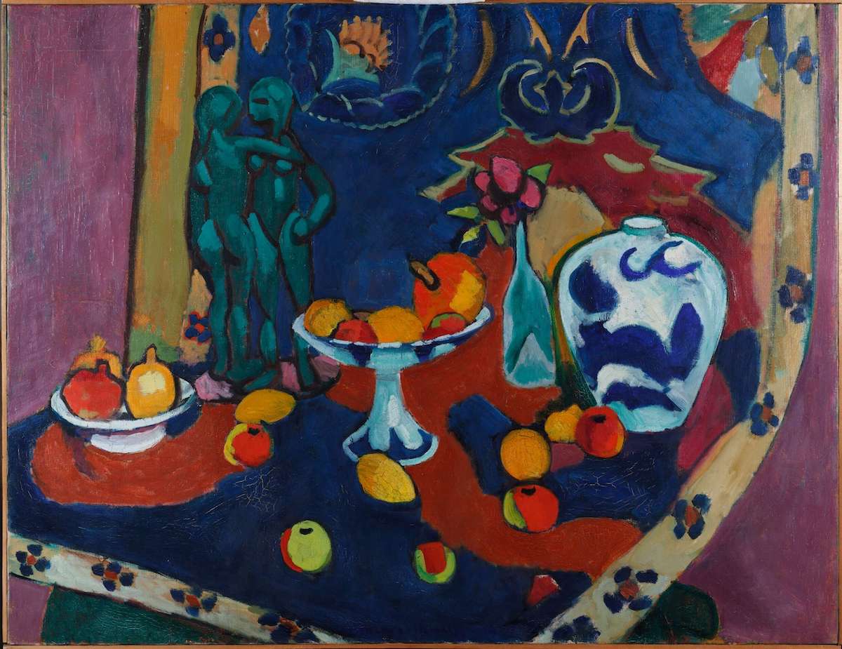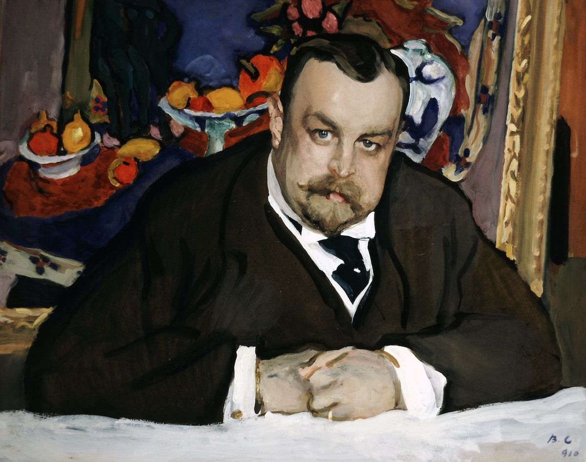 Valentin Serov, Portrait of Ivan Morozov (1910) (left), Henri Matisse, Fruit and Bronze (1910) (right)