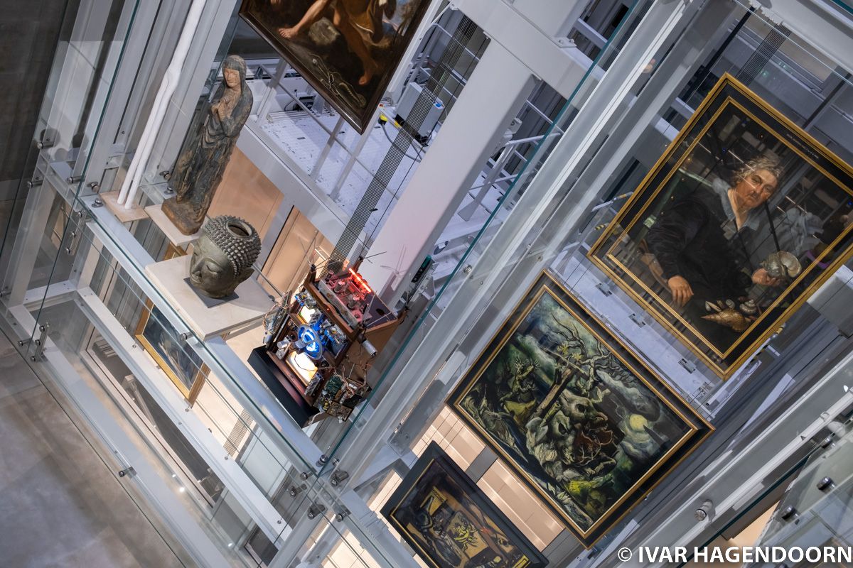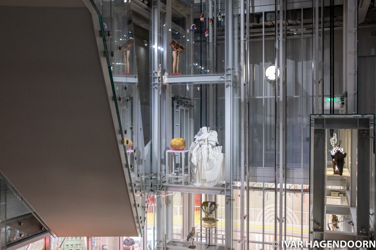 The heart of the building is a five storey atrium with transparent elevator shafts and a maze of stairs. Walking through the building is tremendous fun with paintings, sculptures, fashion and furniture wherever you look. Just don't expect to learn anything about any of the objects on display, for that you would (probably) need to consult an app. There are no signs indicating artist, title and year. This is not a museum.