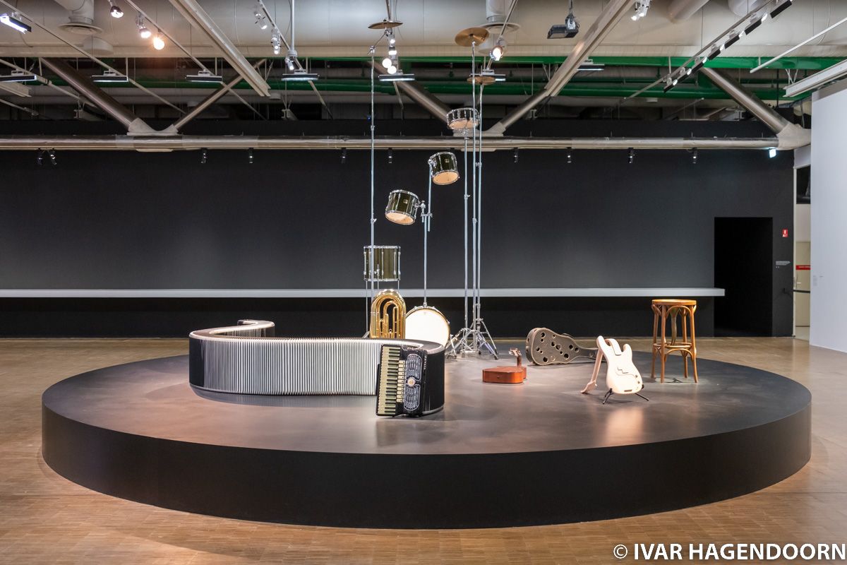 I didn’t think much of some of his conceptual sculptures, though, a nightmare flute that has been almost entirely perforated, a guitar with a drooping neck, an extended accordion, a drum kit set at meters high stems. Like so much conceptual art I look at it and think, ahh, clever, funny, but that is it.