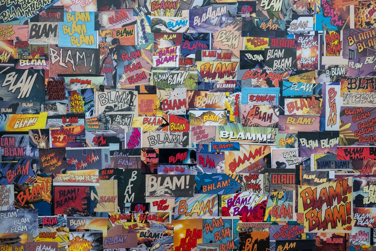 Another constant in Marclay’s work is his fascination with comic books. In his paintings, drawings and collages, that are reminiscent of both pop art and abstract expressionism, Marclay often appropriates onomatopoeias taken from comic books, “BOOM”, “SNAP”, “THWAK”, “VROOM”, “BANG!!”.