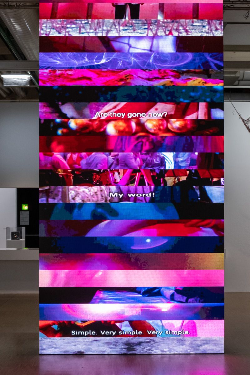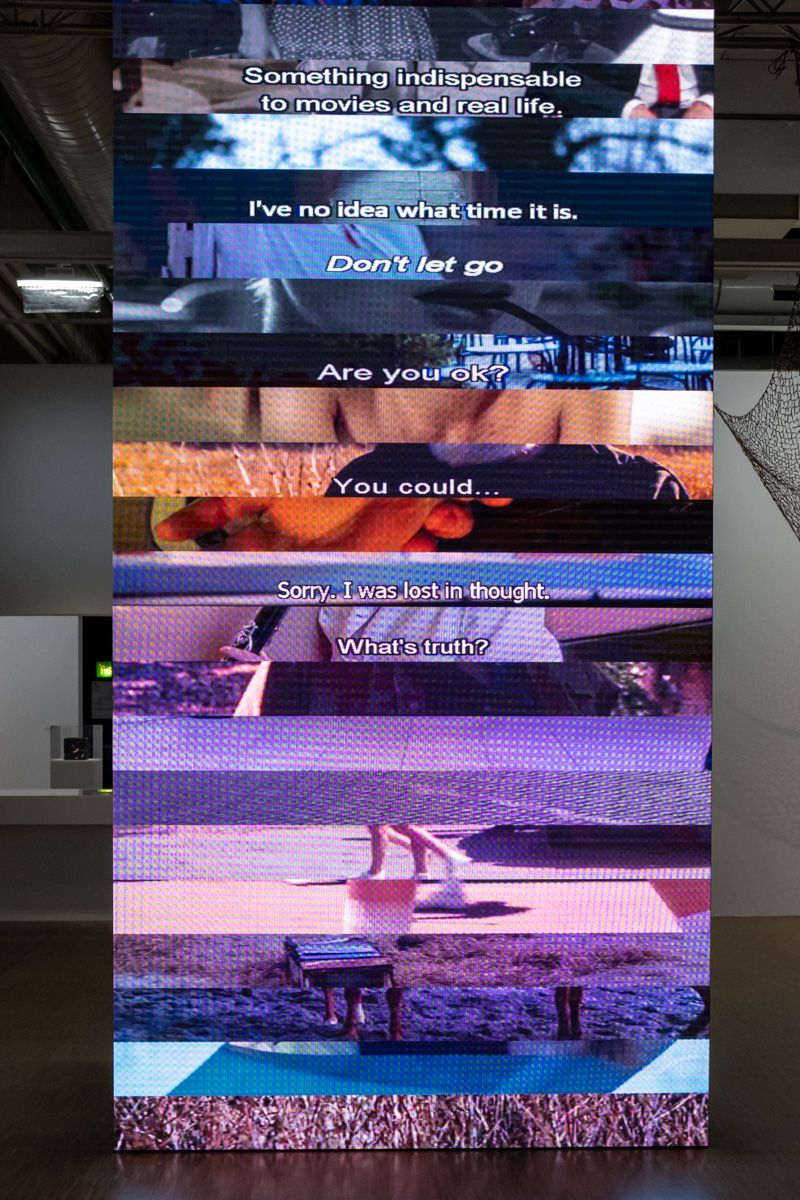 It is in his video works that Marclay’s intelligence shines. “All Together” (2018) samples hundreds of Snapchats. “Subtitled” (2019) consists of a stack of subtitle strips, interspersed with image excerpts. "Telephones" (1995), which can be seen as a study for "The Clock", is an eight-minute montage consisting of movie clips in which the phone rings and someone dials, picks up, hangs up or smashes down the receiver. It is funny and nostalgic, with its rotary dials, phone booths and the scrambling for change. "Doors" (2022), which has its premiere at the exhibition, is composed out of movie clips in which a character opens, closes or passes through a door. These works reveal the conventions of cinema, but they also show that human communication itself is to a large extent conventional. This, incidentally, is the reason for the success of large language models like ChatGPT. They exploit the fact that texts, conversations and so on, frequently use the same turns of phrase.