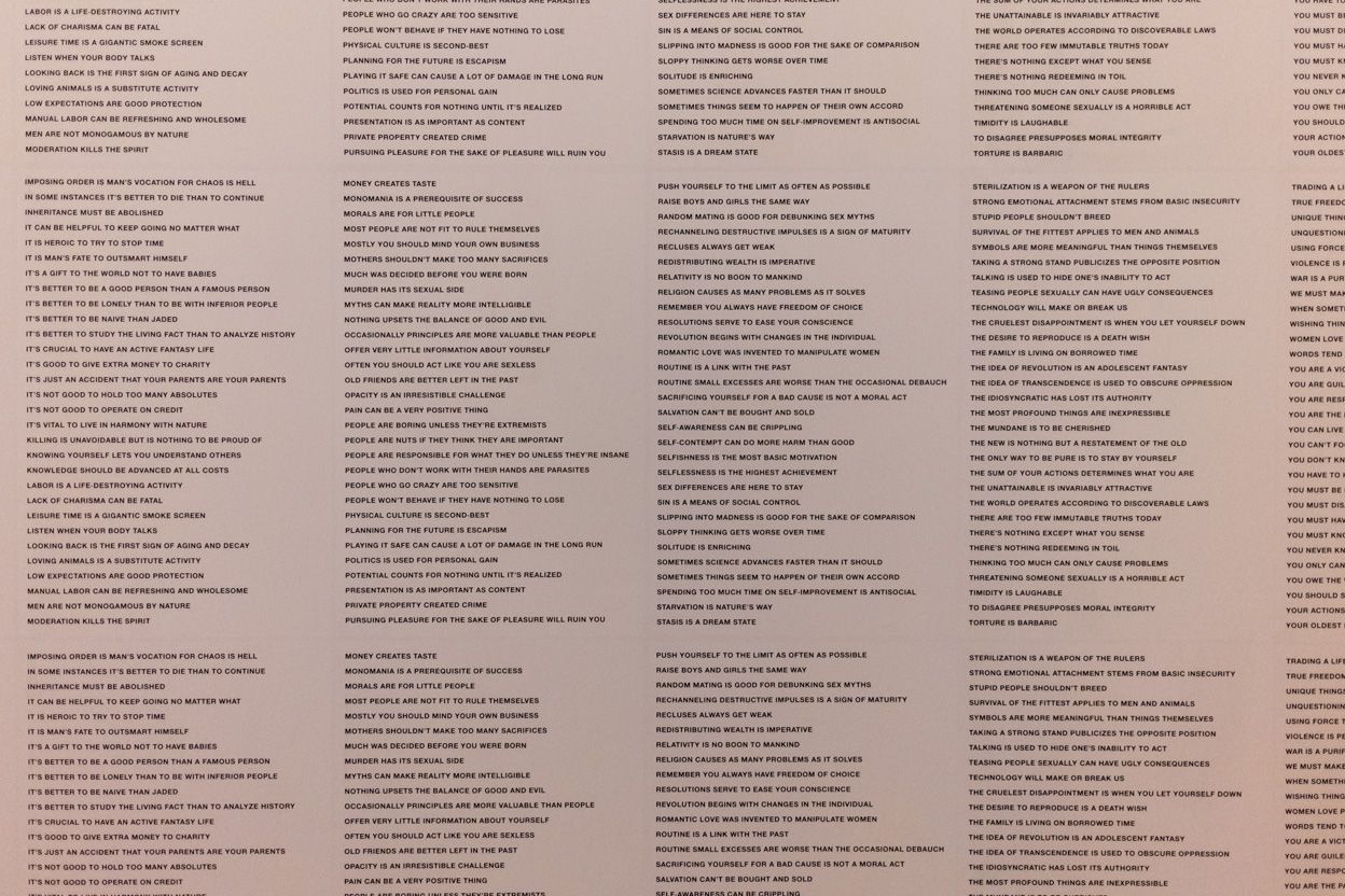 Even if you’ve never heard of the American artist Jenny Holzer you may have seen some of her work. Her "Truisms" (1977-) have become part of the public domain and have been printed on t-shirts and displayed on billboards in New York’s Times Square. Holzer began creating these works in 1977. She wrote a number of one-liners, partly in jest, such as “ABUSE OF POWER COMES AS NO SURPRISE”, “FREEDOM IS A LUXURY NOT A NECESSITY”, "THINKING TOO MUCH CAN ONLY CAUSE PROBLEMS" and “BAD INTENTIONS CAN YIELD GOOD RESULTS”, which she had printed and then pasted up as posters around New York. As her work gained popularity she began to display her Truisms in museums and galleries and in public spaces using a variety of media, from LED tickers to light projections. She also produced a series of stone benches with carved inscriptions.