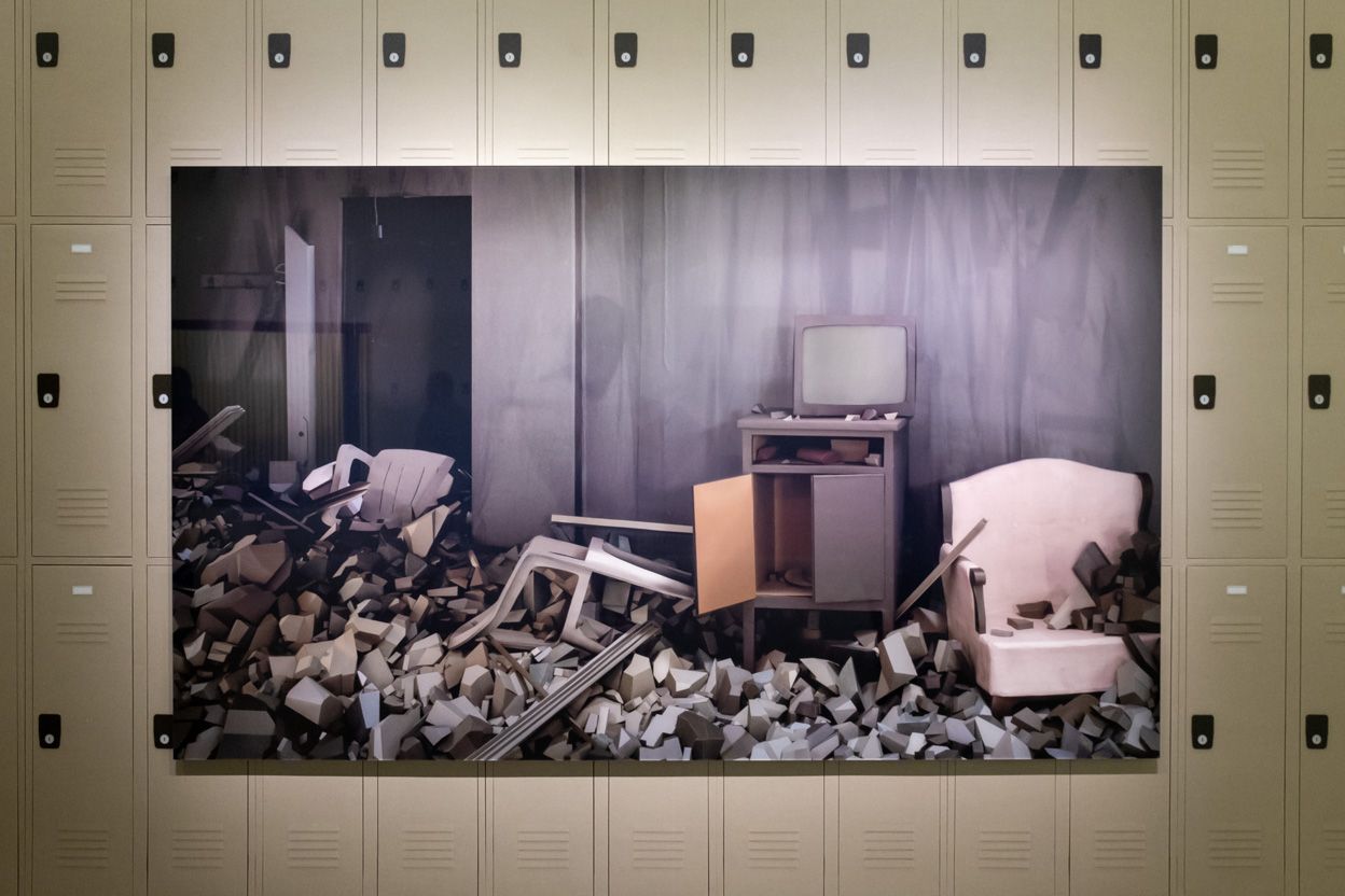 I was once again intrigued by the amount of work that must have gone into making the incredibly detailed models. "Kontrollraum/Control Room" (2011) looks like a generic industrial control room, complete with computer screens, control levers and what appear to be operating manuals. If you look closely you notice that something is amiss. The plastic tiles of the ceiling have come loose and hang above the desks. In fact the set recreates the control room of the abandoned nuclear power plant in Fukushima in the aftermath of the 2011 earthquake and tsunami. "Ruine/Ruin" (2017) shows a room reduced to rubble. It is the kind of generic image with which we have become all too familiar. It could have been an earthquake, a hurricane or a missile strike. Demand’s models and photographs are devoid of human presence, but when you look at this image you realize the human tragedy that it represents.