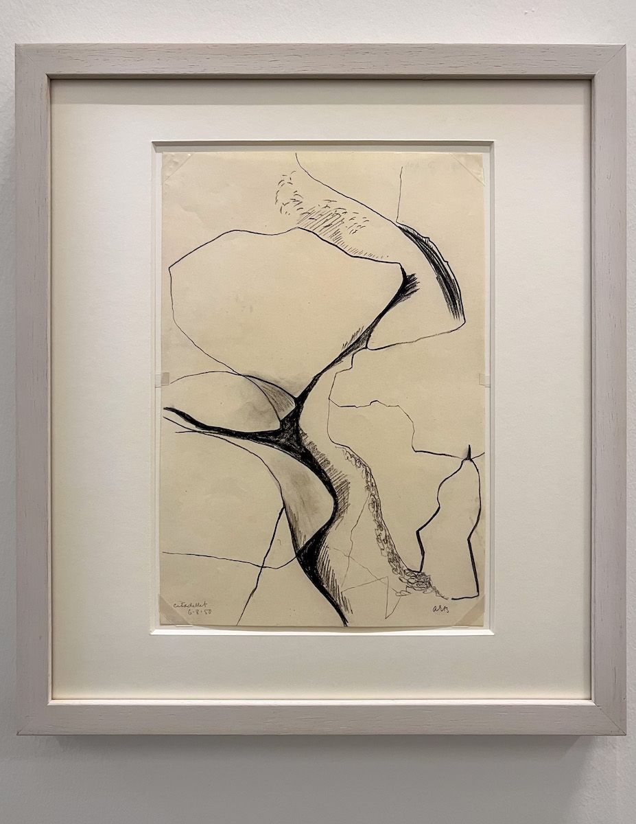 Anna-Eva Bergman spent the summers of 1949, 1950 and 1951 on the island of Citadelløya, in southern Norway. It was during these journeys that she became interested in stones, fault lines and the grooves in rocks and began to develop her own pictorial language. She also made her first painting using gold leaf. Later she would also start using silver leaf. In the late 1950s Bergman created a series of works on paper with a kind of alphabet of forms: stone, moon, mountain, valley, tree etc.
