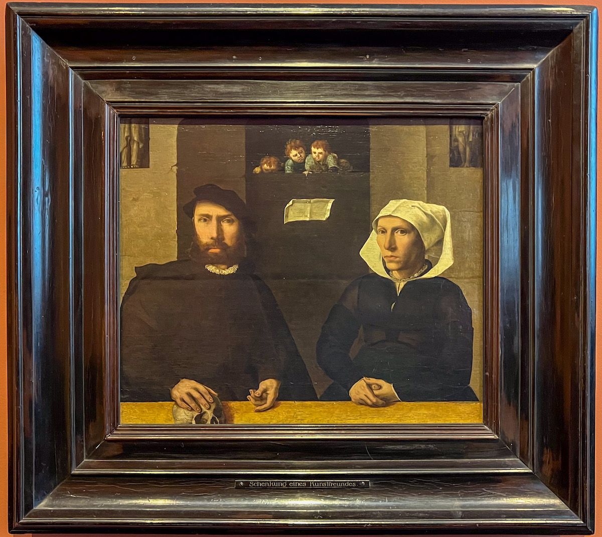 I find it interesting that the artist chose to paint himself with his right hand on a skull. It's also interesting that, lacking a proper mirror, which only became available several decades later, the facial features of his wife appear more lifelike.