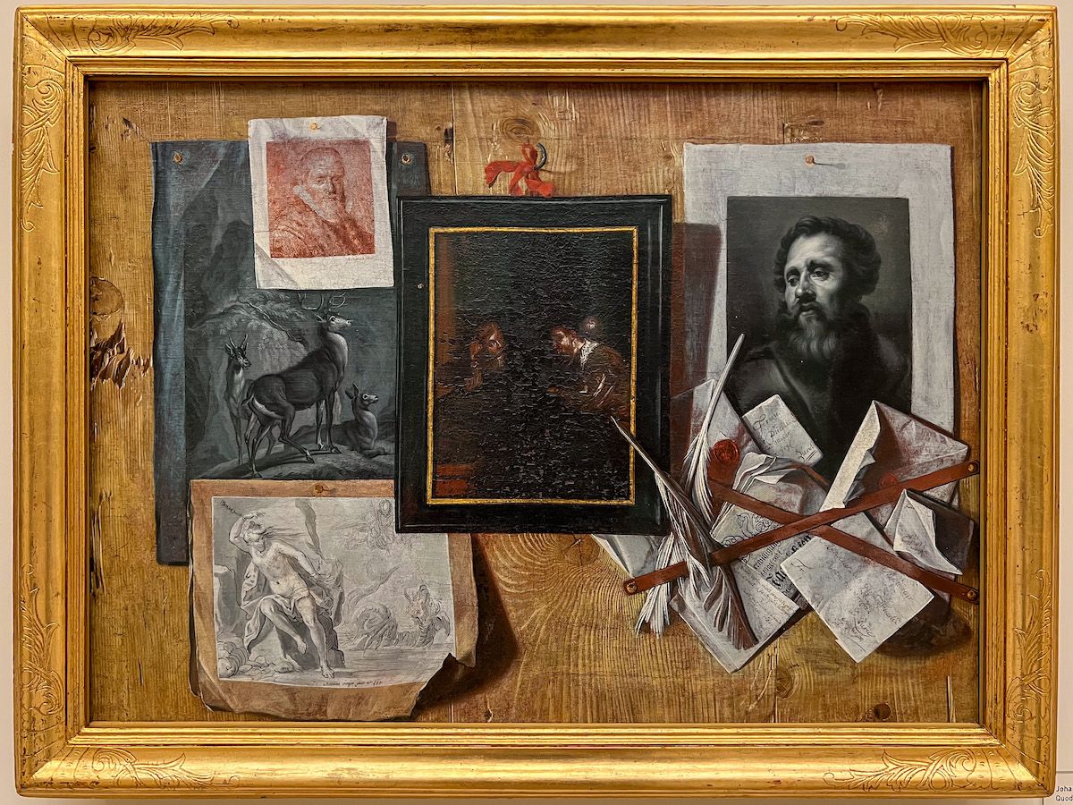 This is a typical trompe l'oeil painting, which were popular at the time and which painters made to showcase their craftmanship. I couldn't see close enough, but I wondered whether the drawings are actual drawings or paintings of drawings.