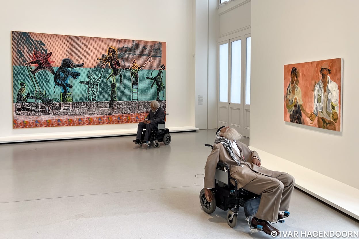 Le monde comme il va (The World as it Goes) is one of the most interesting exhibitions I’ve seen at the Bourse de Commerce so far. “Old People’s Home” (2007) by Sun Yuan and Peng Yu, which features life-size puppets of politicians and religious leaders slumped in electric wheelchairs, is hilarious and timely. It is shown against the backdrop of “Circus Figures” (2005) by Sigmar Polke and Ghost Ball (2023) by Salman Toor, which make for a perfect pairing.