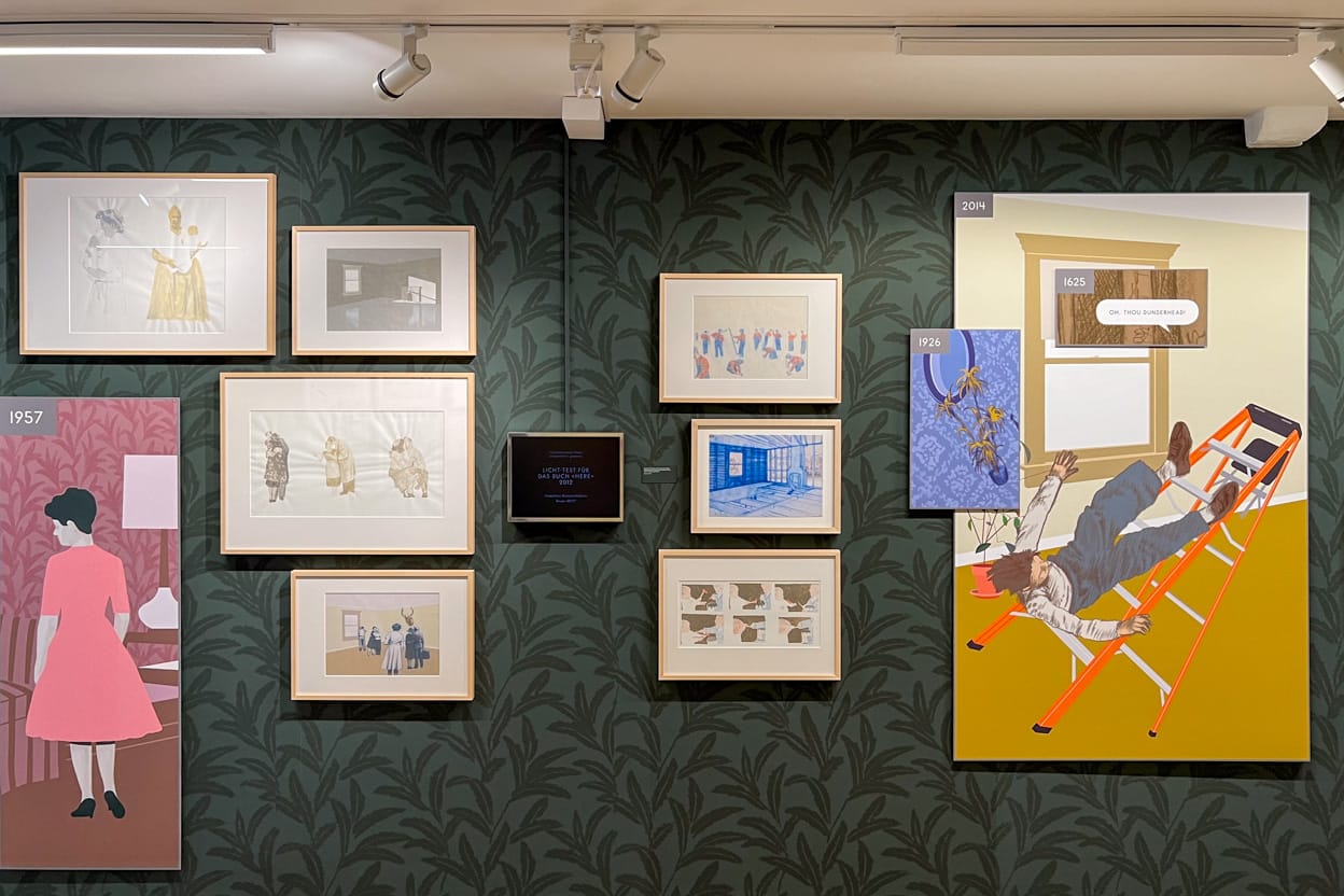 The exhibition is a masterclass in creativity and imagination. I was struck by McGuire’s conceptual ingenuity. Many of his illustrations are highly intelligent and funny in a subtle way. The prime example is, of course, Here, which is set in an anonymous living room and lets the reader travel through time, from the first appearance of life on Earth through the 19th and 20th century and into the future. It is currently being made into a film by Robert Zemeckis, starring Tom Hanks and Robin Wright, to be released at the end of 2024.