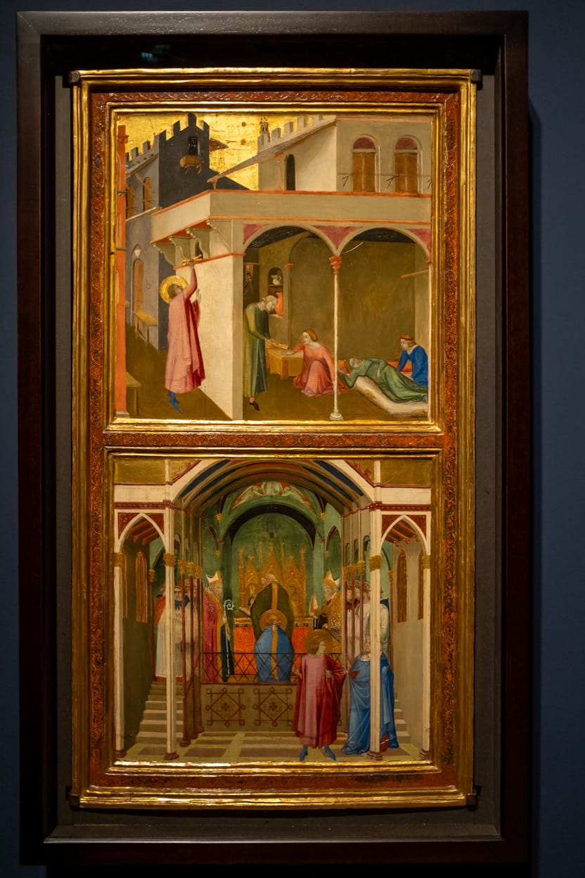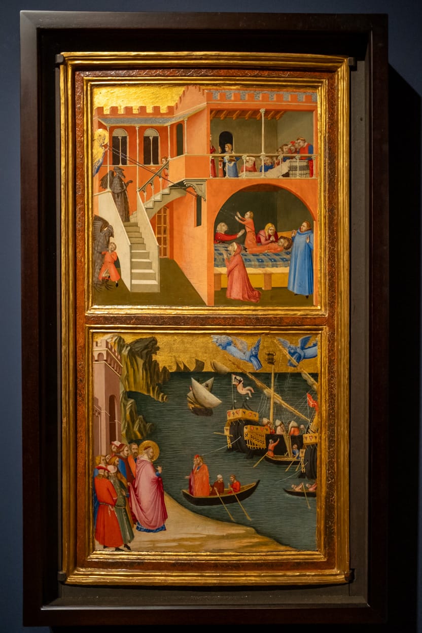 My favourite work in the exhibition is a diptych by Ambrogio Lorenzetti. One of panels shows Saint Nicholas intervening in the tale of a child strangled by a clawed devil disguised as a pilgrim. The boy breathes, chokes, lies dead and revives all in one scene as Ambrogio experiments with depicting a narrative arc in a single panel. In this painting Ambrogio rivals many contemporary comic book artists in inventiveness.