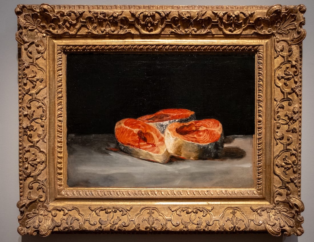 The exhibition opens with a wonderful painting by Francisco Goya of three salmon steaks. With its bold reds against a black background it prefigures Manet. It hangs next to a painting of a large wave crashing upon rocks by Gustave Courbet. It reminded me of Hokusai’s “The Great Wave off Kanagawa” (1831), which I think is the more iconic of the two.