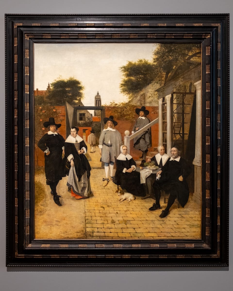 Rembrandt’s “Portait of a Young Woman” (1632) is by no means a “minor” Rembrandt, just look at the expressivity of her hands. It would be on permanent view if it were part of the collection of the Rijksmuseum or London’s National Gallery. It hangs next to a group portrait by Pieter de Hooch, “Family Group in a Courtyard in Delft” (c. 1658), which showcases his mastery of perspective and spatial composition. The open door in the wall reveals two neighboring courtyards. The man seen from behind in the distance provides a sense of scale.