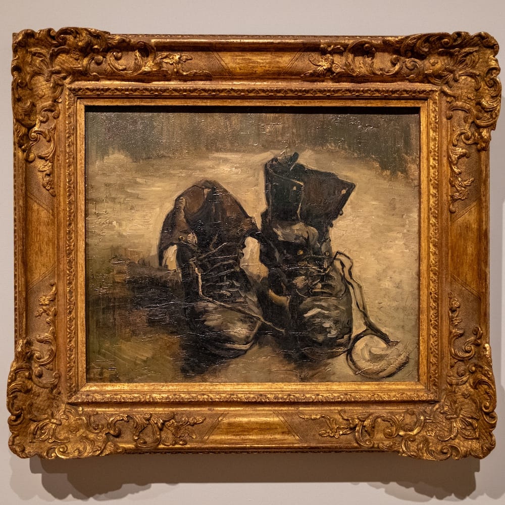 Over at the Van Gogh Museum the exhibition includes Van Gogh’s “Shoes” (1886), arguably the most famous shoes in the history of art and philosophy. Martin Heidegger saw the painting at an exhibition in Amsterdam in 1930. He went on to write about the painting in a key passage in The Origin of the Work of Art (1935). In The Still Life as a Personal Object (1968), the art historian Meyer Schapiro criticized Heidegger for wrongly referring to the shoes as those of a peasant woman. In Restitutions of the Truth in Pointing [‘Pointure’] (1978) Jacques Derrida playfully questions both Heidegger’s and Schapiro’s interpretation, while giving a masterclass in close reading in the process.