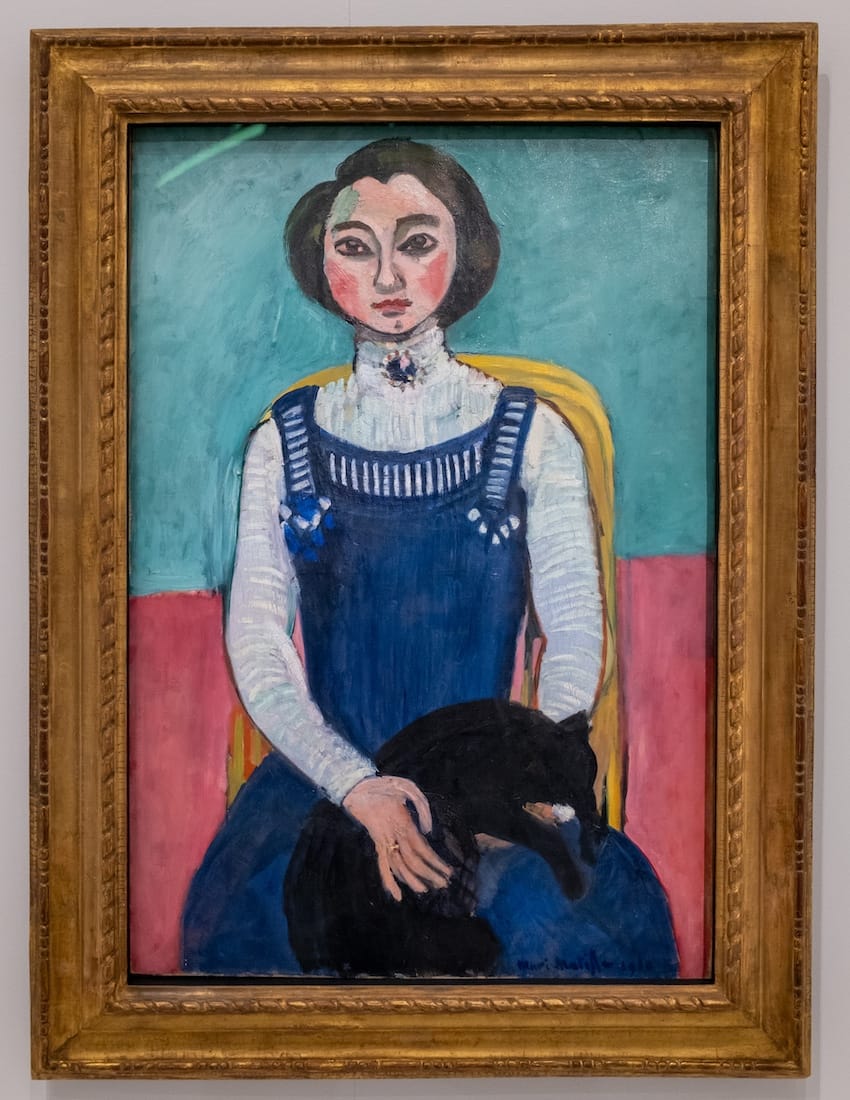 Born in 1894 to Matisse and his model Caroline Joblaud, Marguerite grew up within the close-knit Matisse family after his marriage to Amélie Parayre. Illness shaped her early years: after a tracheotomy at age seven, she often concealed her scar with the black ribbon that became a distinctive feature of her portraits. Denied regular schooling, she became a “studio child,” constantly present as her father worked. From the mid-1900s onward, Matisse painted her in various moods: first as a quiet child, then as a self-assured teenager. These early portraits, including the wonderful “Marguerite Reading” (1906) and the equally delightful “Marguerite with a Black Cat” (1910), reveal both tender intimacy and bold experimentation in form and color.