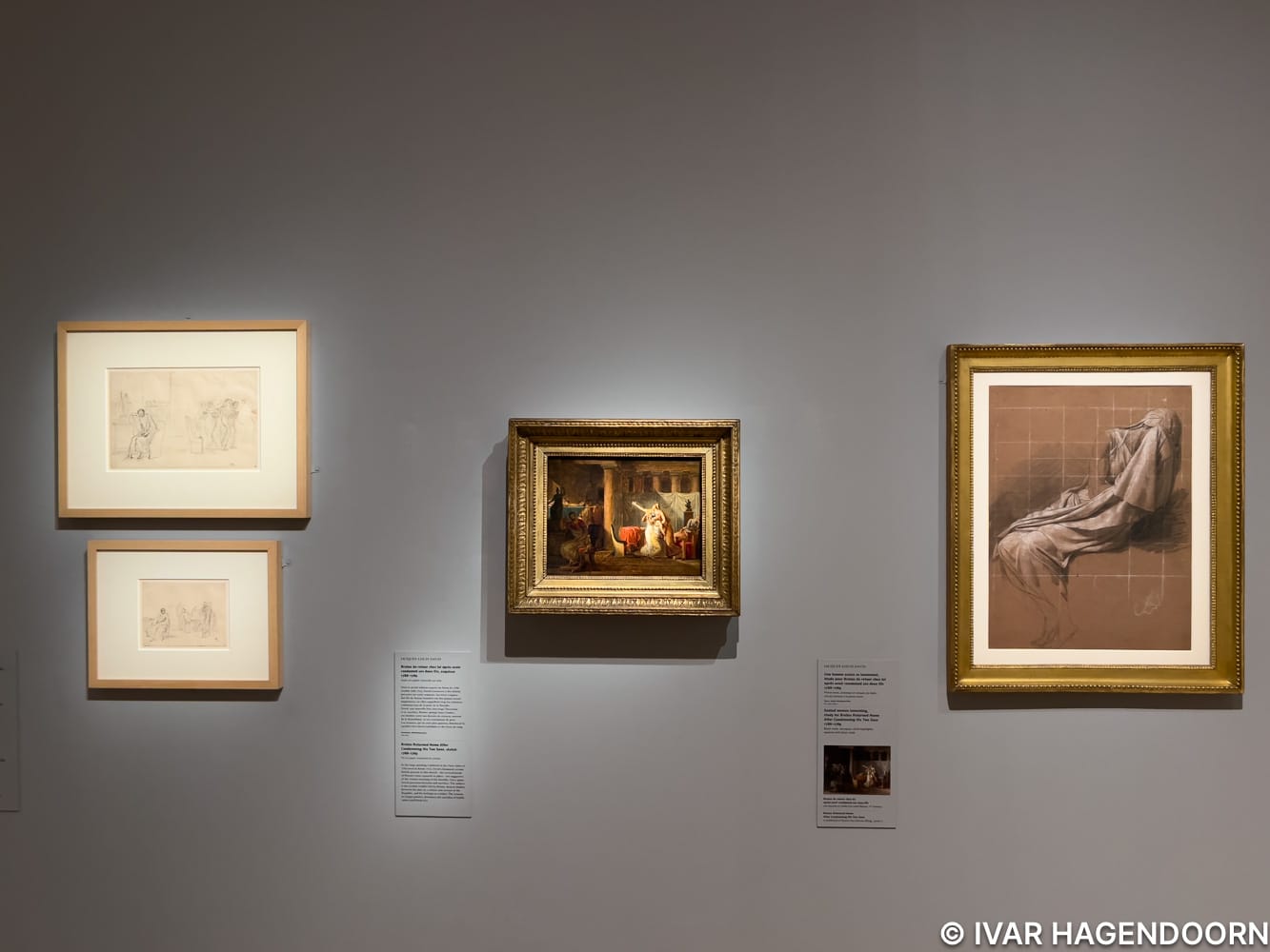 Jacques-Louis David, "Le serment des Horaces" (1785) detail (middle) and preparatory sketch (left). Sketch for "Brutus et ses fils" (1789) (right)