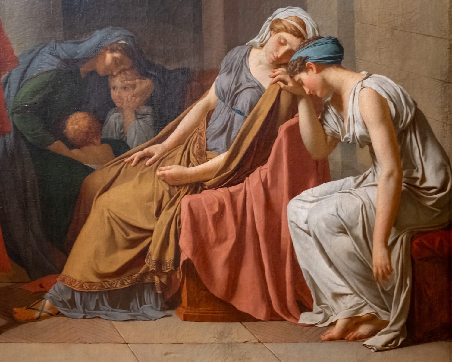 David struggled for years to establish his artistic identity. He is even said to have considered suicide after four successive failures to win the Royal Academy's Prix de Rome. In 1774, having finally won the Prix de Rome, he moved to Rome for a residency at the French Academy. In 1779, he suffered an artistic crisis, which eventually led him to move beyond the neoclassicism of Poussin and the realism and chiaroscuro of Caravaggio. In 1783, at the age of 35, he became an official member of the Royal Academy. Two years later, he exhibited his first masterpiece, “The Oath of the Horatii” (1785). During this period, David painted mainly large canvases depicting scenes from antiquity, such as “The Death of Socrates” (1787) and “The Loves of Paris and Helen” (1788), of which he created two nearly identical versions for different clients. A painting like “The Lictors Bringing Brutus the Body of His Sons” (1789) takes on a different meaning once you consider the revolutionary temper spreading through Paris and France at the time.