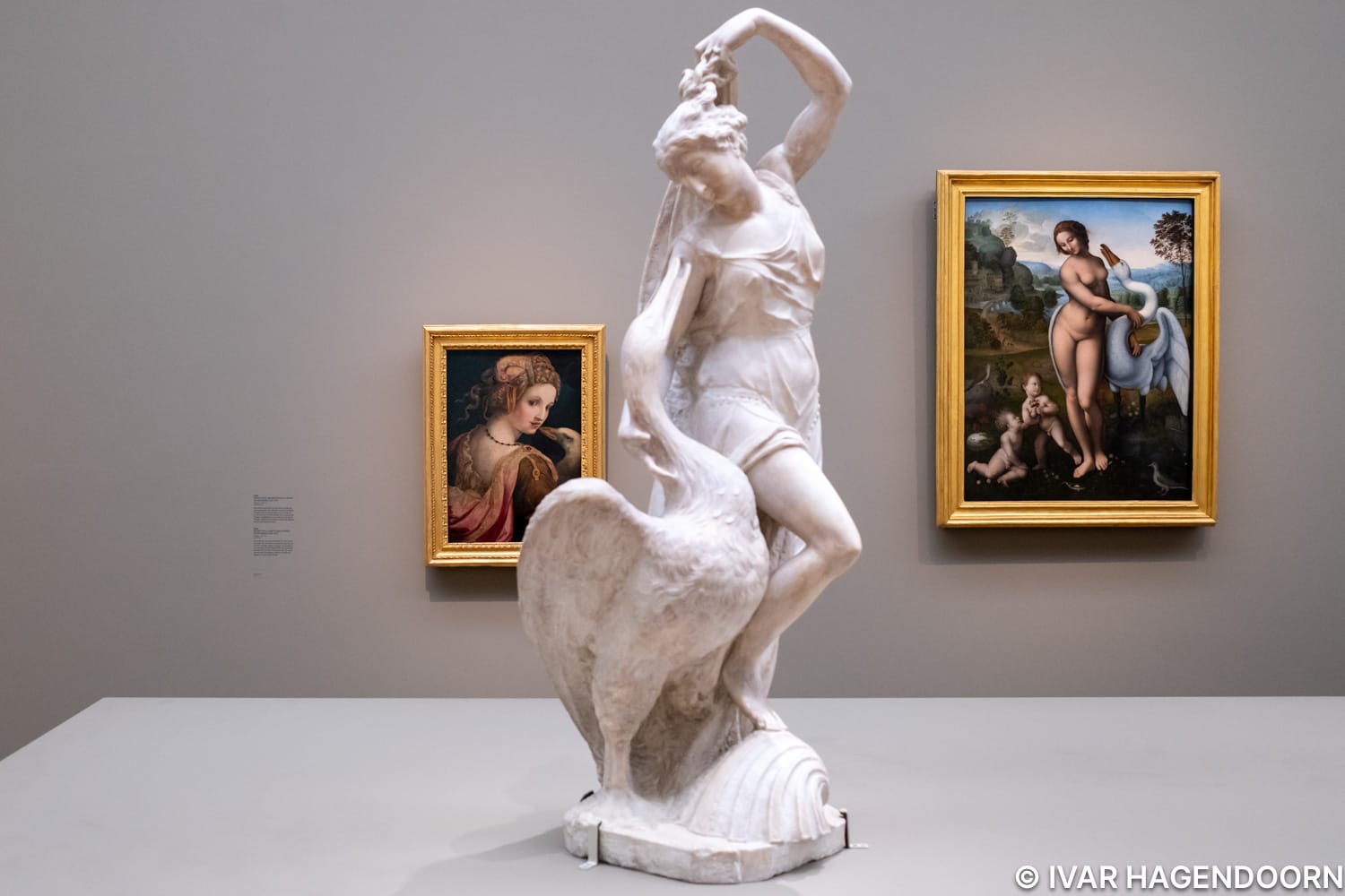 The curatorial selection foregrounds the myths most fervently revisited across centuries — the creation, Danaë's golden rain, Leda's entanglement with the swan, Arachne and Narcissus's fatal self-regard. What elevates the presentation beyond a conventional survey is its insistence on juxtaposition: Correggio's languorous Danaë hangs in dialogue with Titian's stormier rendition; a medieval Flemish tapestry depicting a velvet-cloaked Narcissus, his name emblazoned on his thigh like a modern brand logo, competes with Caravaggio's chiaroscuro close-up. Pygmalion and Galatea likewise command attention: Jean-Léon Gérôme's classic rendition, on loan from New York’s Metropolitan Museum of Art and Rodin's nonfinito liberation of the beloved from marble are presented next to Paul Delvaux's 1939 inversion of the myth, in which a nude woman falls for a stone boy. Such pairings reveal not only the malleability of each myth but also demonstrate how each era reshapes Ovid's raw material to suit its own obsessions.
