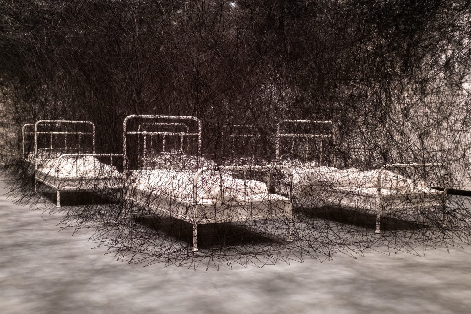 The first room, “Threads of Life” (2026), features a dense web of scarlet threads with hundreds of vintage keys dangling from the threads. In the middle of the room an open wooden door makes for a perfect photo-op if you’re visiting with a friend. It certainly looks great and I admire the work that goes into creating the installation, but the symbolism of the door and the keys is a bit too obvious for me. The same goes for the other two room-filling installations. “Letters of Thanks” (2026) consists of a forest of red threads suspended from ceiling to floor, with letters of gratitude attached. The final room, “During Sleep” (2026), consists of several vintage unmade white metal hospital beds complete with pillow and blanket overgrown by a web of black threads. It is straight out of a fairy tale.