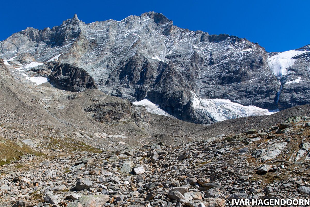 I'd originally planned to hike to the Lac d'Arpitettaz and depending on whether I had good legs to then continue to the Cabane d'Arpitettaz. It was a perfect day and I felt good so I hiked all the way to the hut. The Cabane d'Arpitettaz is situated at the foot of the Weisshorn and in front of the Blanc de Morning and its glacier at an elevation of 2,786 metres. Since Zinal is at 1,675 metres this means climbing (and descending) more than 1,100 metres. Unfortunately the next day the weather changed so the Cabane du Grand Mountet will have to wait until another time. Update: I made it to the Cabane du Grand Mountet!