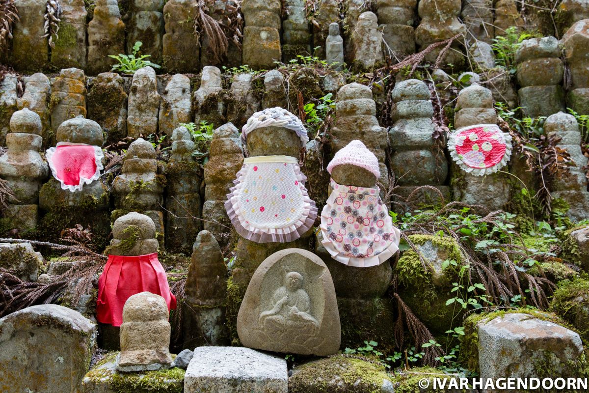 As you can see many statues are dressed in bibs and little knit caps. Some are even adorned with lipstick. These icons are called Jizos, or Jizo Bosatsu, named for a Bodhisattva divinity of Buddhism that has been part of Japanese culture for centuries. The caps and scarves are added to protect the divinity from the elements, while the bibs symbolize Jizo’s protection of children.