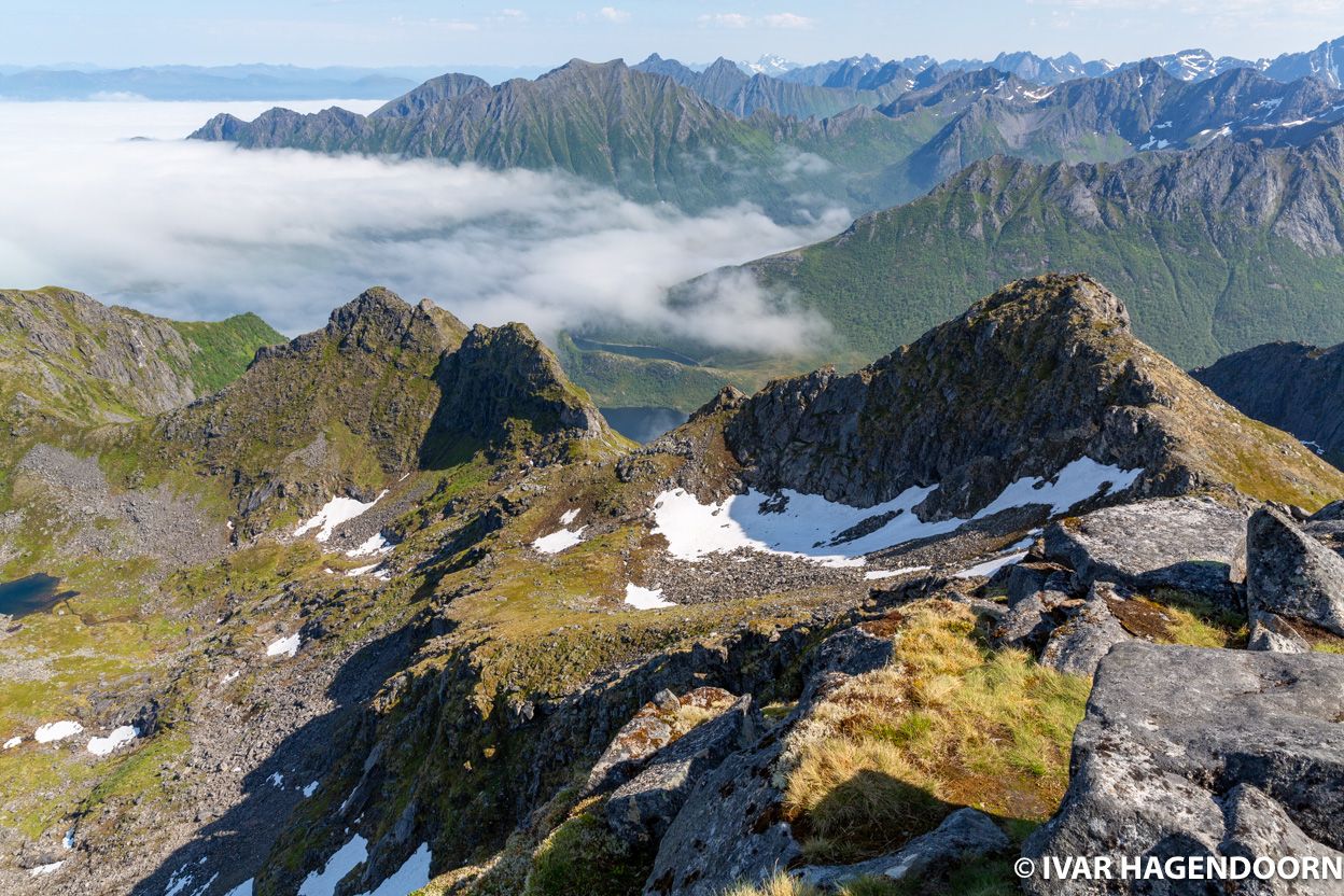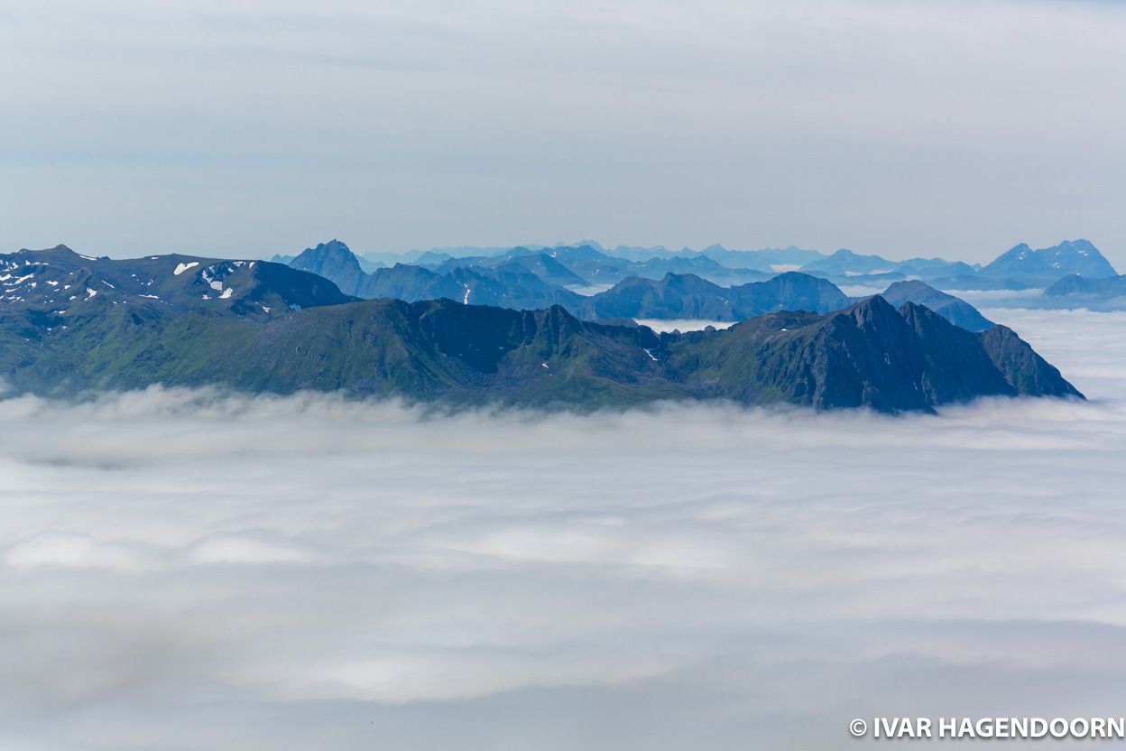 The hike to Matmora (788m) is one of the best hikes in Lofoten offering spectacular views along the way. When I left my hotel in Svolvaer it was all sunny and blue skies, but as I drove towards the west I saw clouds appearing. It was still sunny when I started hiking, but clouds were forming above the fjord. As I neared the top of Matmora at some point I rose above the clouds, which, as always, was pretty awesome.