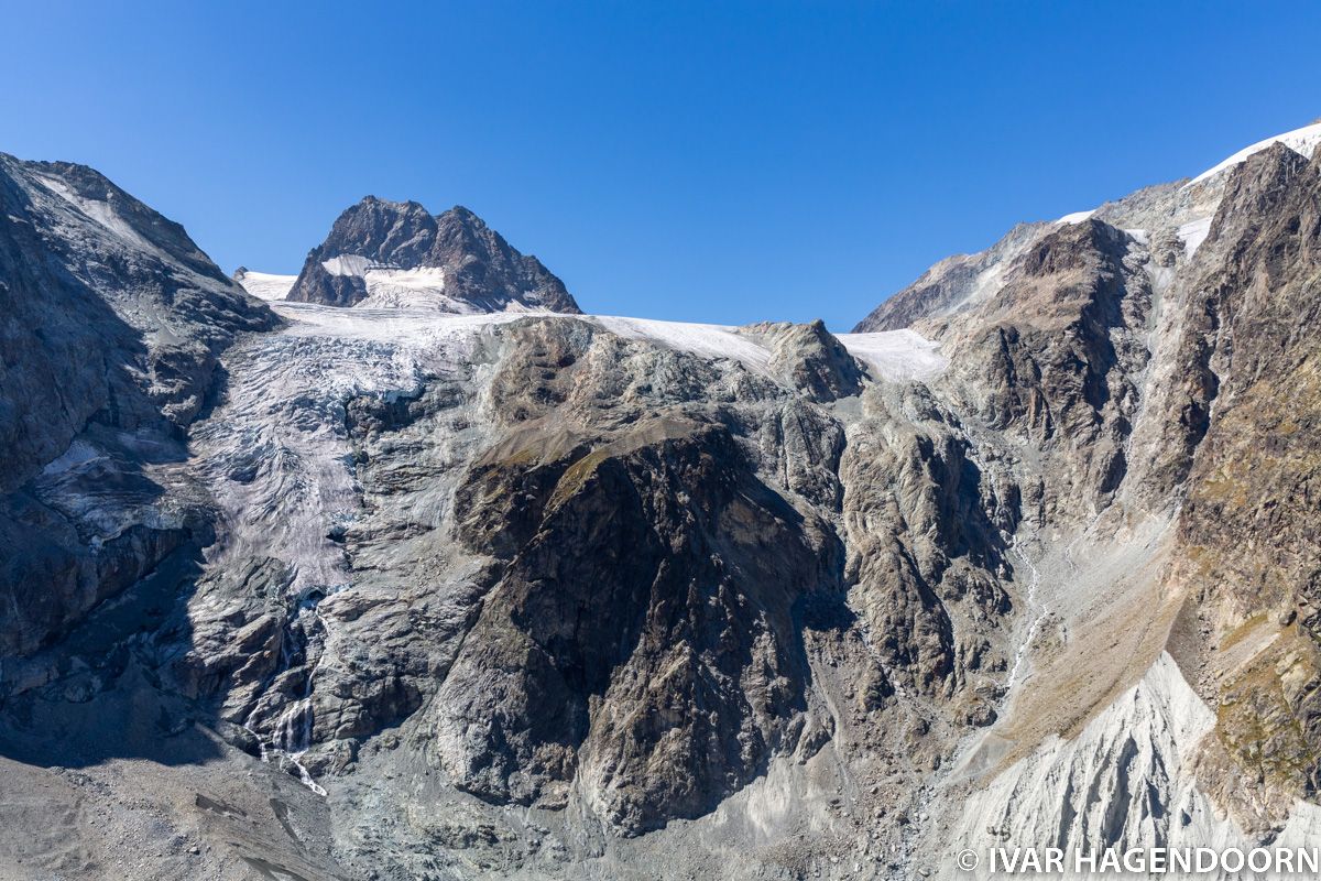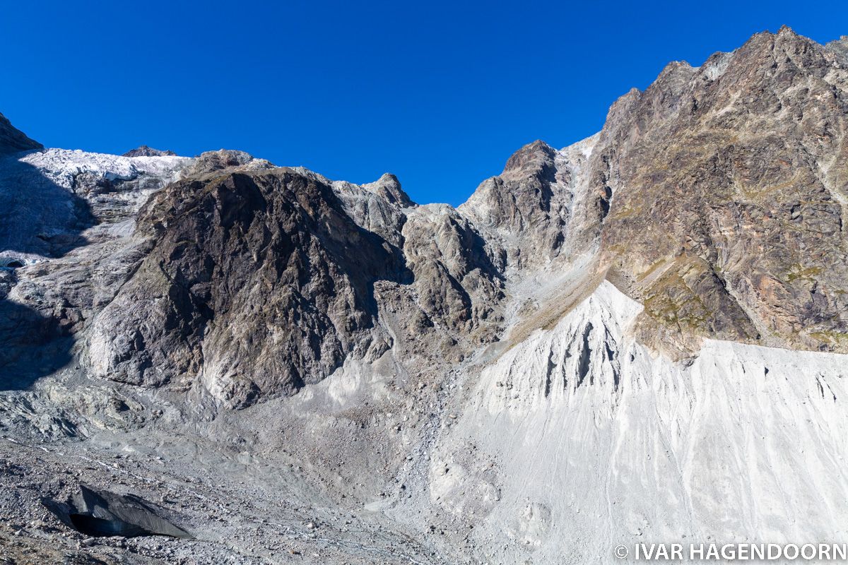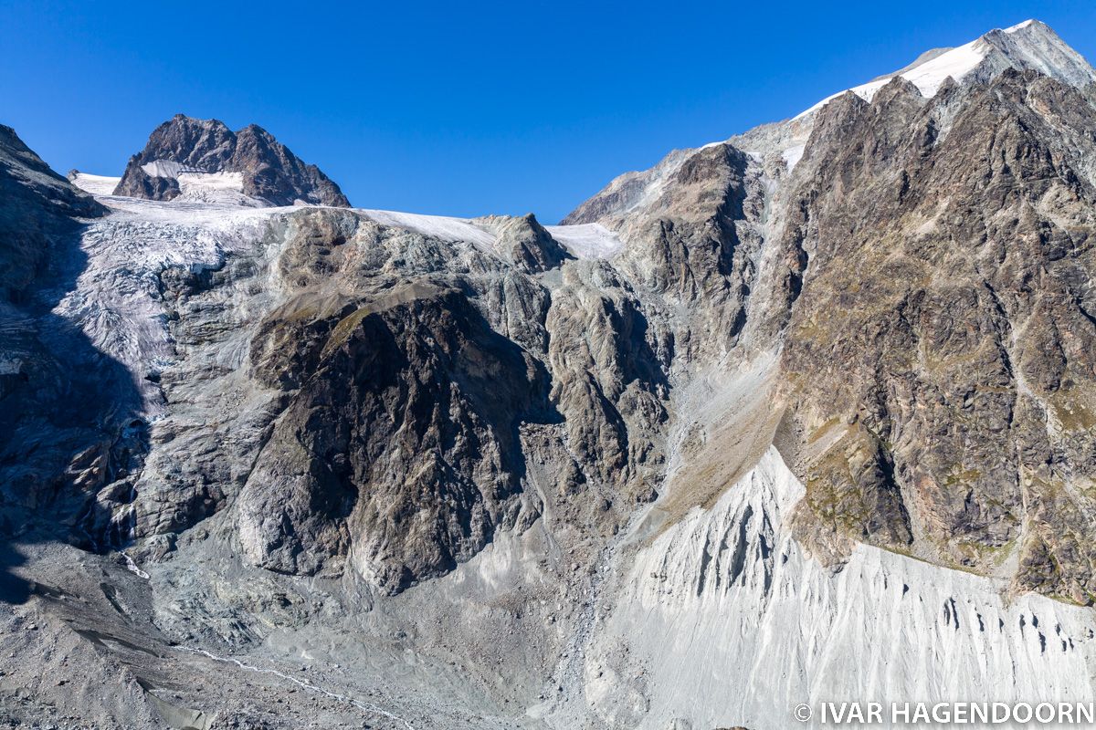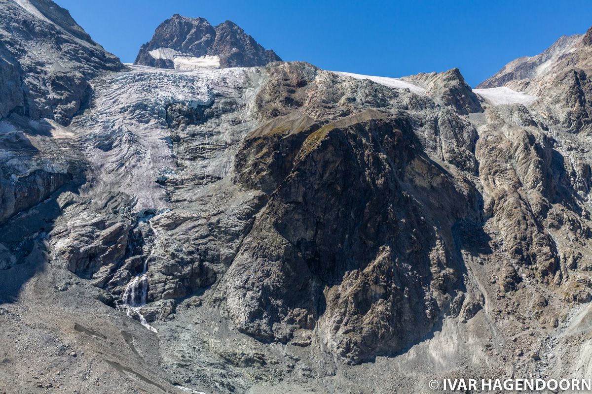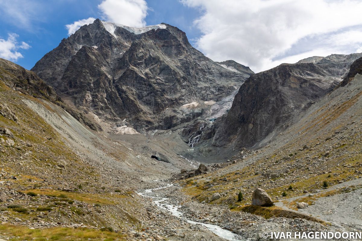... until at some point the glacier on top comes into view. In the distance the Pigne d'Arolla. The "grey" area in the bottom right corner of the photo clearly shows how far the glacier reached a couple of centuries ago.