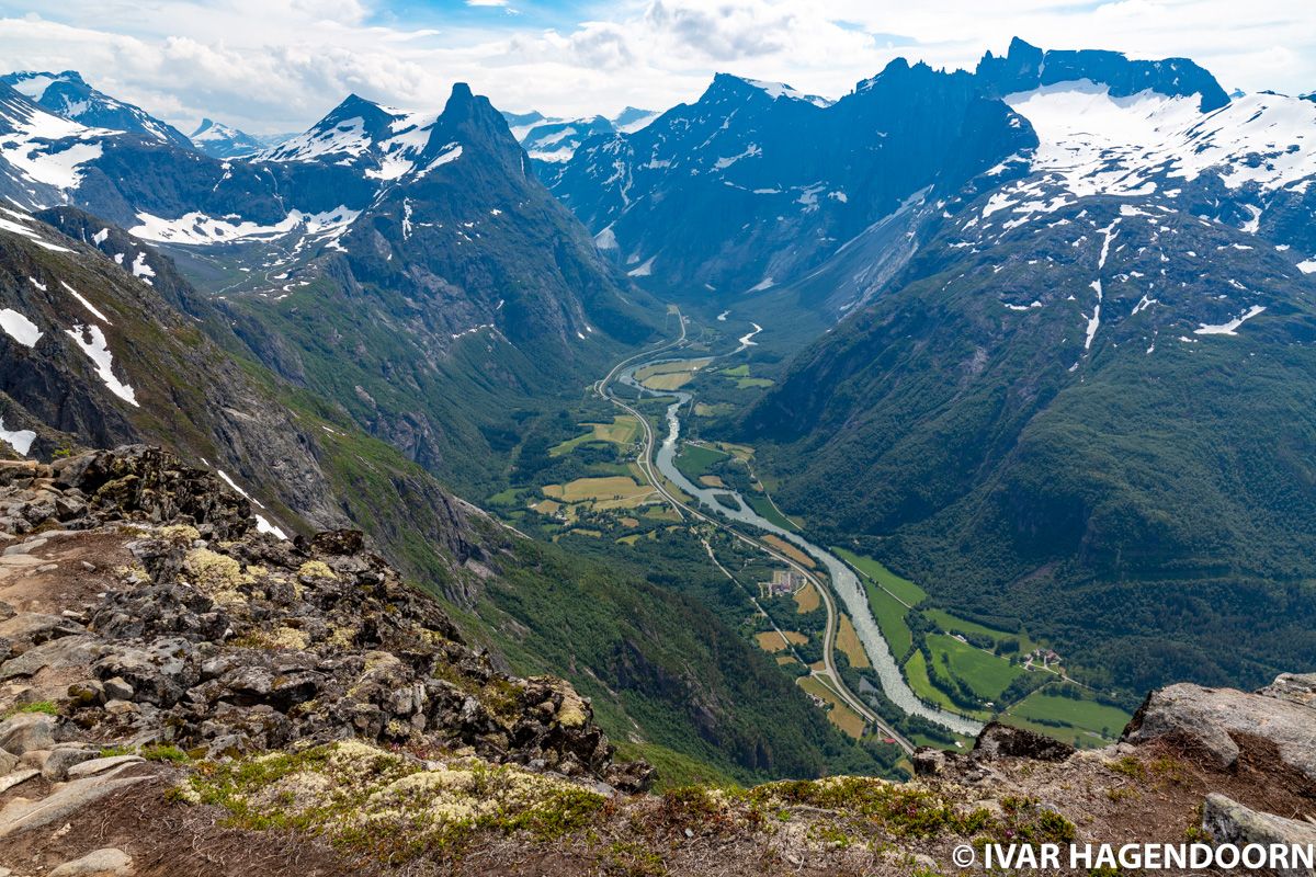 Romsdalseggen is a spectacular ridge hike that offers amazing views of the mountains, valleys and fjords surrounding Åndalsnes. The 10 km long hike reaches an elevation of 1329 meters above sea level at the highest point. I had originally planned to do this hike in 2016 but due to bad weather conditions I had to abandon my plans. My hotel offered a Romsdalseggen package, which includes a drop off at the starting point of the hike. Every morning from June to September, there are also buses from Åndalsnes to the trail head. On the way from Oslo to Åndalsnes I had noticed that the mountains were still covered in snow, but at my hotel they informed me that the trail was doable and that others had completed the hike as well.