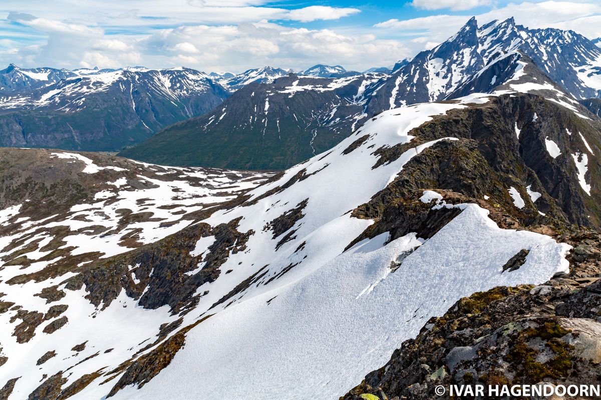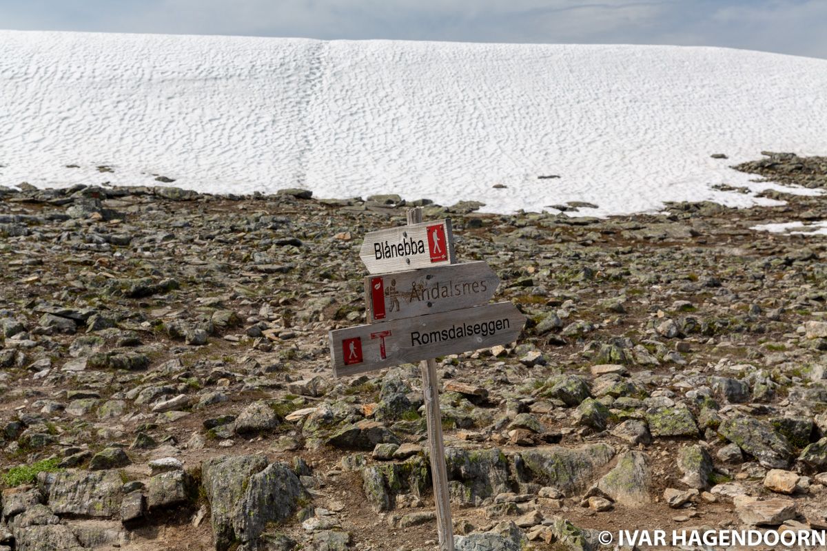 The first plateau was still covered in snow. The sign says that it's 8km to go and that I've already covered 2.5km. Hurray! But it's not just about distance...I made it to the top of the ridge after climbing several hundred meters through a boulder field. Now let's check out the view...Stunning view from Romsdalseggen down towards the rugged peaks around TrollveggenThe view towards Blånebba. Because of the snow I skipped the hike towards the topThe view towards Mjelvafjellet. The hike continues along the ridge.A perfect spot for a snackThe view towards BlånebbaGreat spot to have a profile picture takenThe hike continues along the ridge...The ridge requires some scrambling and a couple of difficult sections are secured with chainsAlmost there...I made it! Looking back to where I came from.
