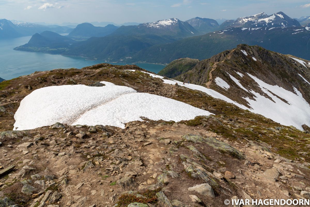 I thought that from here on it would be plain going...Åndalsnes, the destination, in the distance and another ridge...Looking back...One more ridge to go...This is why it's called a ridge hikeLooking back where to I took the previous photoAlmost there. Two more snowfields and one more ridgeThe final ridgeLooking back on an amazing hike. From here you can walk to the new cable car station or walk down to Åndalsnes, which is what I did.