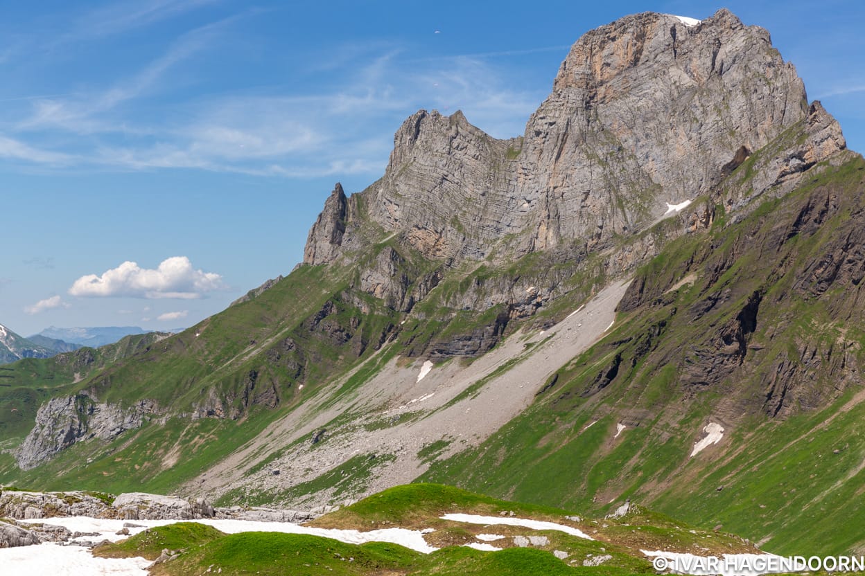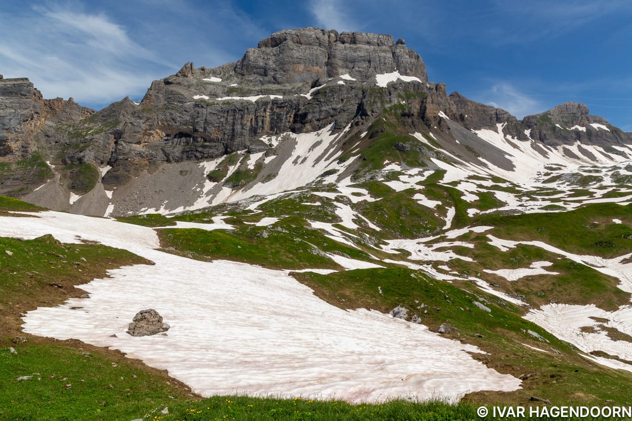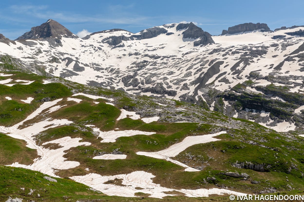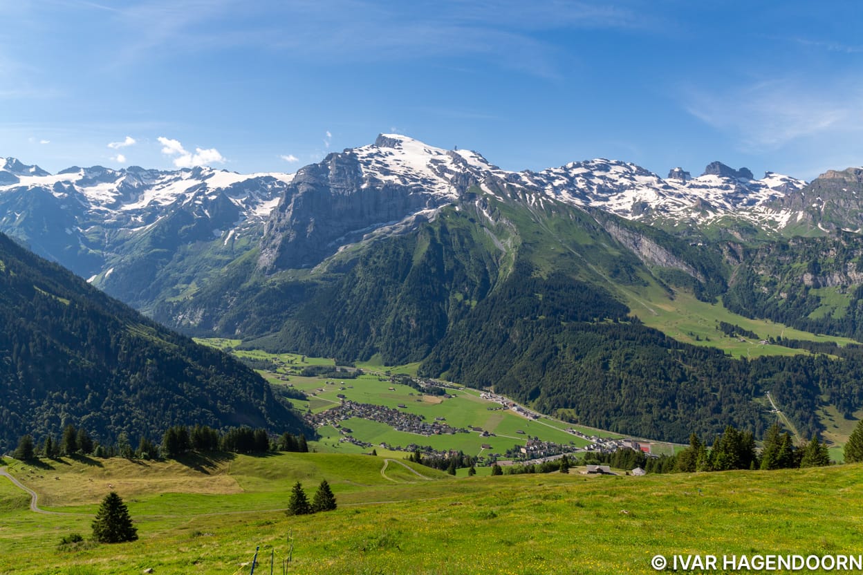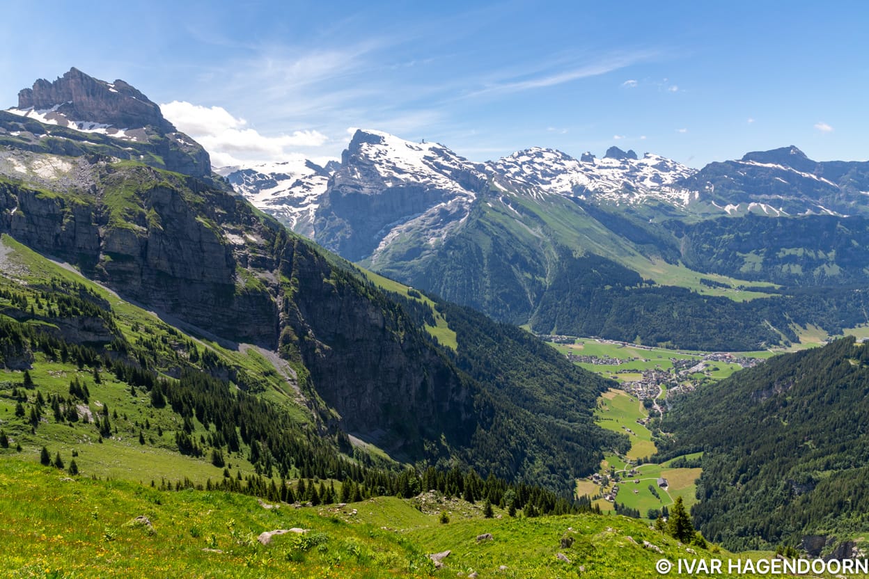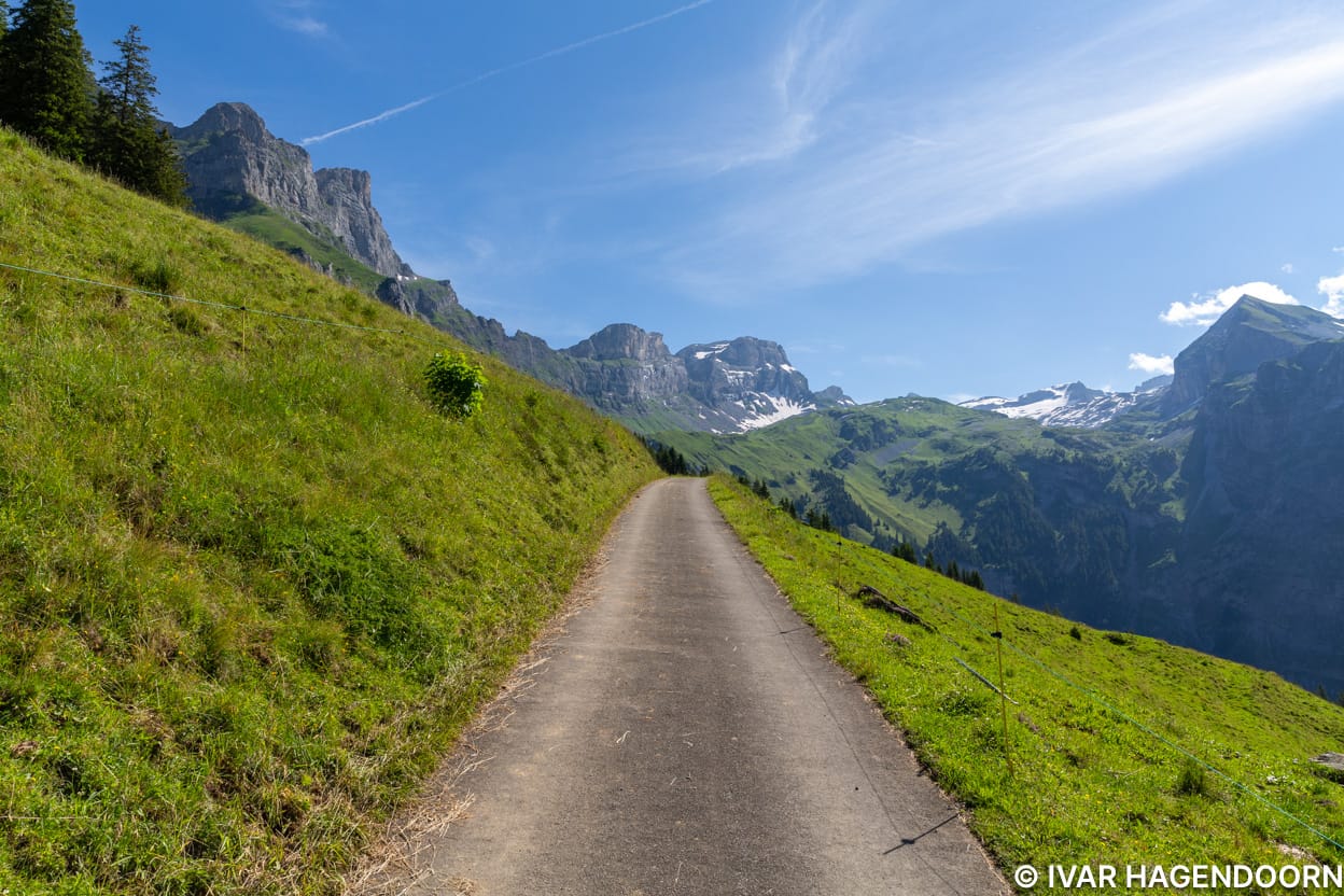 The trail to the Rugghubelhütte. In the distance the hut is already visible. It's on the green mountain on the right.The trail to the Rugghubelhütte offers spectacular viewsLooking down towards EngelbergOnce you reach the Rugghubelhütte a surprise awaits, unless, of course, you have seen these photos. Unlike other huts that have been built with their back against a mountain there is a quite wonderful valley behind the Rugghubelhütte.There was still quite a bit of snow early July, which is why some trails higher up in the mountains were still closed.Looking down towards Engelberg. The snowy peak in the distance is Titlis. I didn't have time to visit Titlis. That'll have to wait until another time. I really enjoyed Engelberg.The first stretch of the trail to the Rugghubelhütte is a paved road. Along the way you pass a farm where you can have a drink and buy cheese.