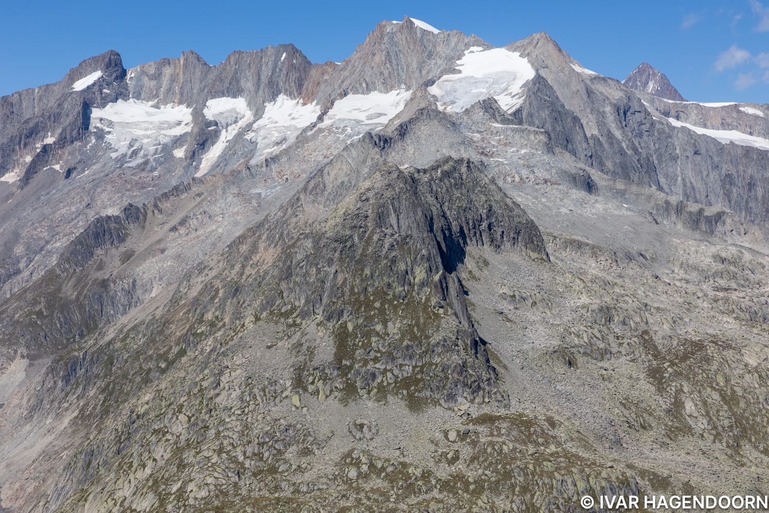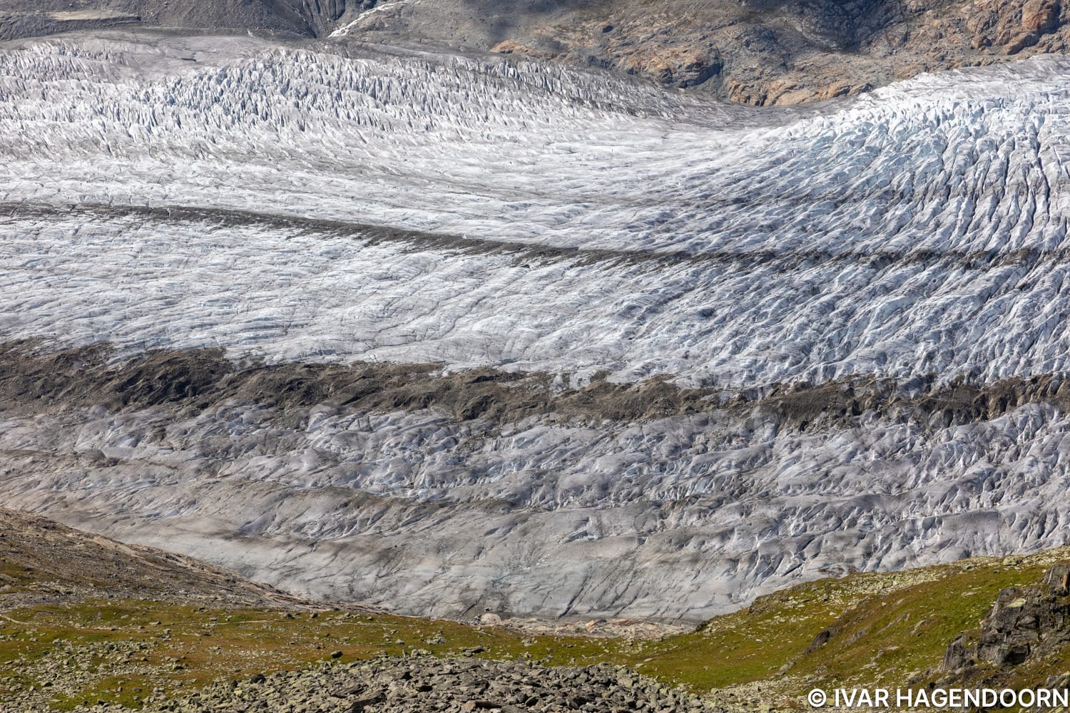 The top of the Eggishorn offers amazing views. Even if you take the cable car up to the Eggishorn cable car station it is worth climbing to the top of Eggishorn. As you can see in the photo above those bands, which are actually piles of rocks, originate on the edge of one of the mountains.