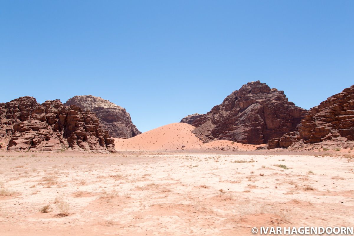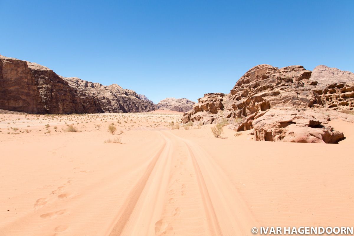 Left: one of the highest sand dunes in Wadi Rum; Middle: The view from the top of the sand dune; Right: Tire tracks in the desert